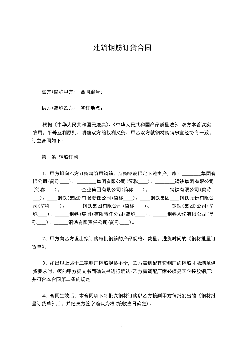 1、甲方拟向乙方订购建筑用钢筋,所购钢筋限定下述生产厂家:________集团有限公司(简称____)、________集团有限公司(简称____)、________钢铁集团有限公司(简称____)、________企业集团有限公司(简称____)、________钢铁有限公司(简称____)、____钢铁(集团)有限责任公司(简称____)、____钢铁集团____钢铁股份有限公司(简称____)、______钢铁集团有限公司(简称____)、________钢铁(集团)公司(简称____)、______钢铁(集团)有限责任公司(简称____)、______钢铁股份有限公司(简称____)、______钢铁有限责任公司(简称____)。