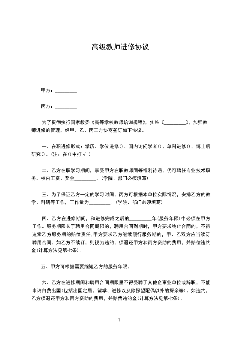 为了贯彻执行国家教委《高等学校教师培训规程》,实施《_________》,加强教师进修的管理,经甲、乙、丙三方协商签订如下协议。