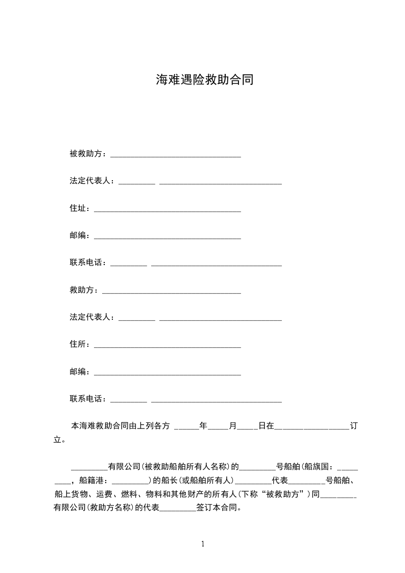 _________有限公司(被救助船舶所有人名称)的_________号船舶(船旗国:_________,船籍港:_________)的船长(或船舶所有人)_________代表_________号船舶、船上货物、运费、燃料、物料和其他财产的所有人(下称“被救助方”)同_________有限公司(救助方名称)的代表_________签订本合同。