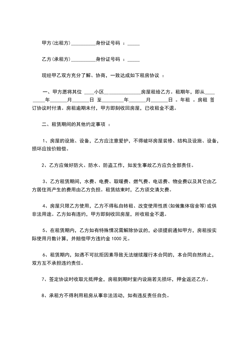 8、承租方不得利用租房从事非法活动,如有违反责任自负。