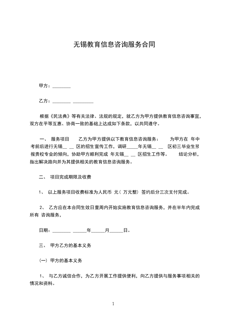 一、 服务项目 乙方为甲方提供以下教育信息咨询服务: 为甲方在 年中考前后进行无锡__ __ 区的招生宣传工作,调研_____年无锡__ __ 区初三毕业生预报贵校专业的倾向,协助甲方顺利完成 年无锡__ __ 区招生工作等。 结论分析,指出解决路向并为其提供相关的教育信息咨询服务。