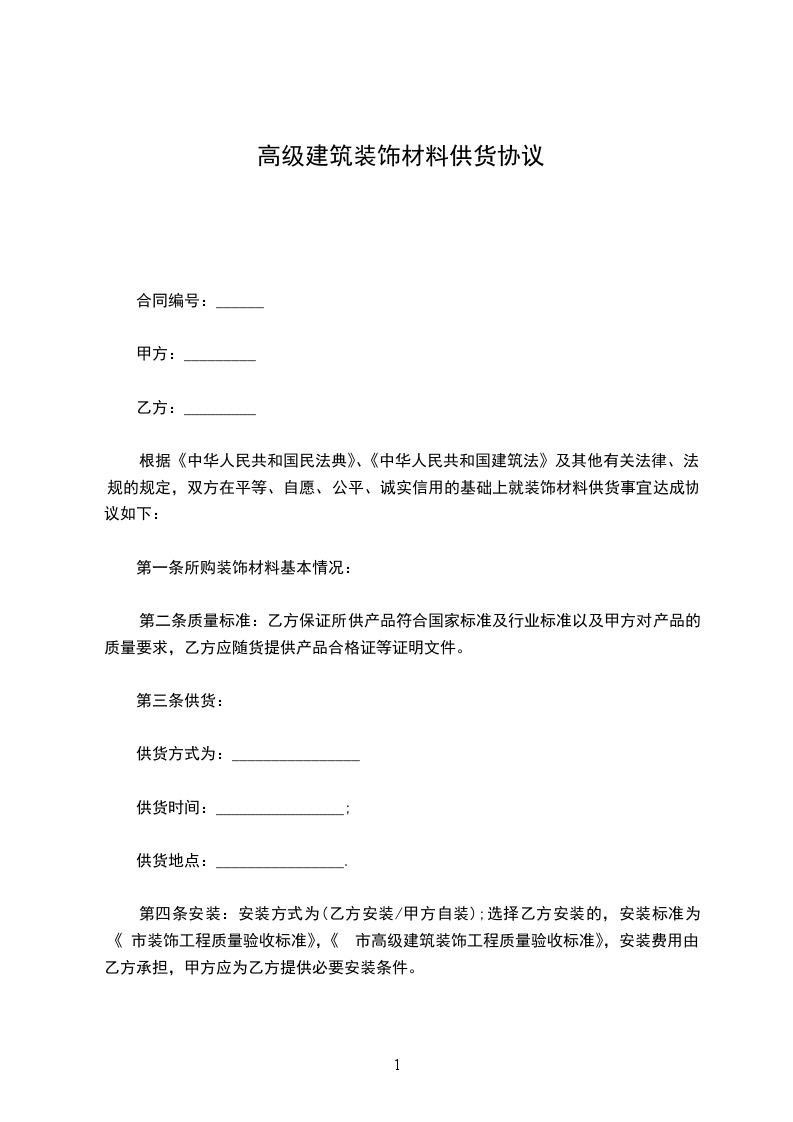 根据《中华人民共和国民法典》、《中华人民共和国建筑法》及其他有关法律、法规的规定,双方在平等、自愿、公平、诚实信用的基础上就装饰材料供货事宜达成协议如下:
