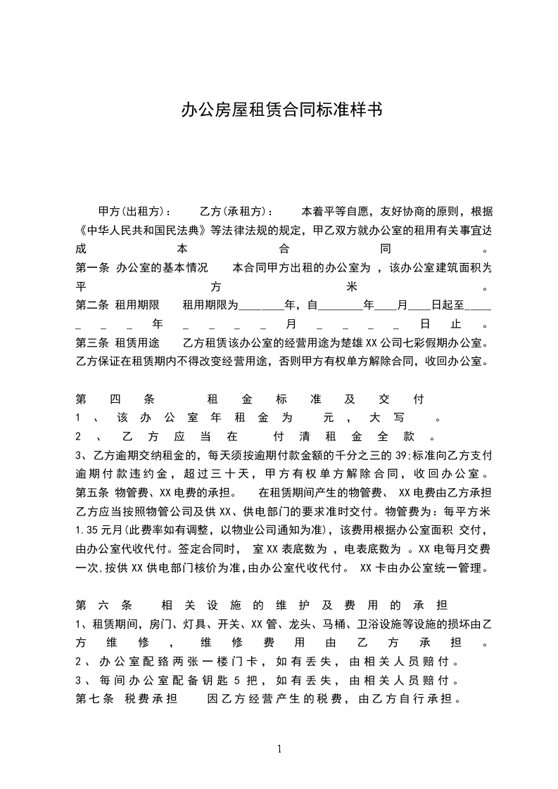 甲方(出租方): 乙方(承租方): 本着平等自愿,友好协商的原则,根据《中华人民共和国民法典》等法律法规的规定,甲乙双方就办公室的租用有关事宜达成本合同。