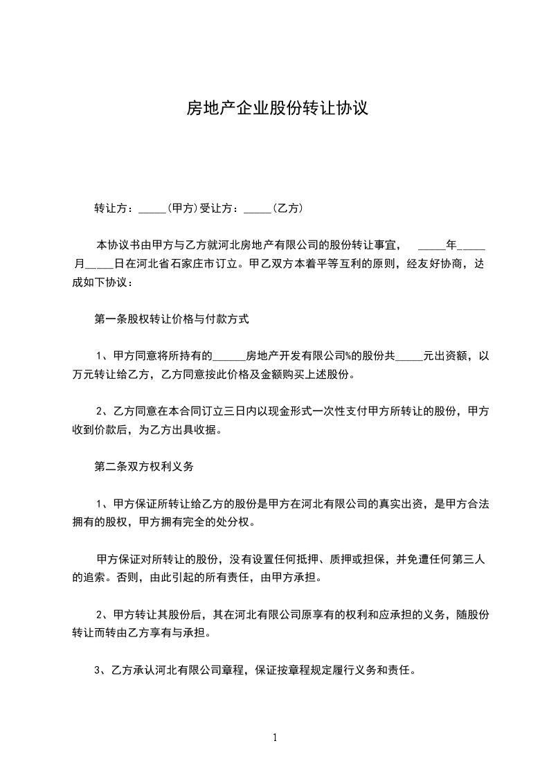 本协议书由甲方与乙方就河北房地产有限公司的股份转让事宜, _____年_____月_____日在河北省石家庄市订立。甲乙双方本着平等互利的原则,经友好协商,达成如下协议: