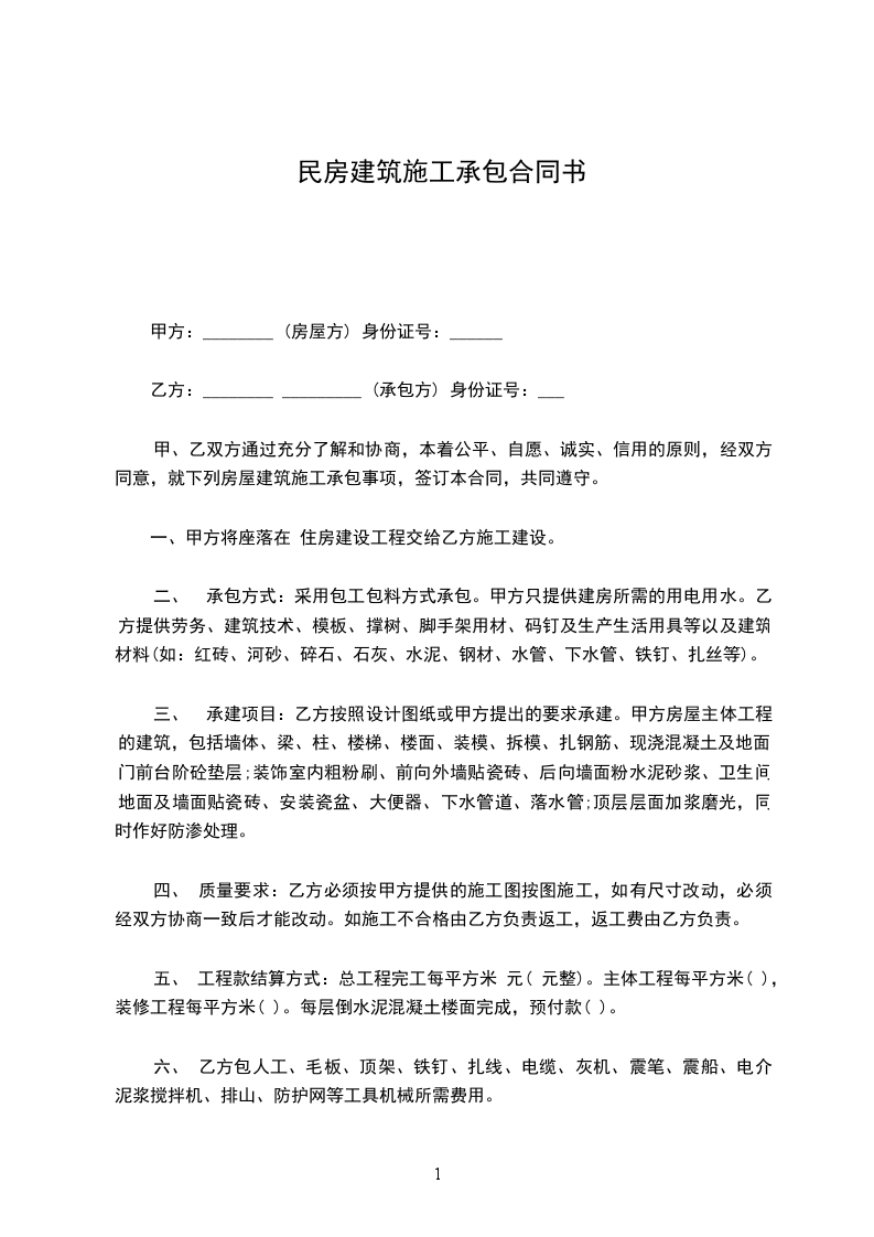 二、 承包方式:采用包工包料方式承包。甲方只提供建房所需的用电用水。乙方提供劳务、建筑技术、模板、撑树、脚手架用材、码钉及生产生活用具等以及建筑材料(如:红砖、河砂、碎石、石灰、水泥、钢材、水管、下水管、铁钉、扎丝等)。