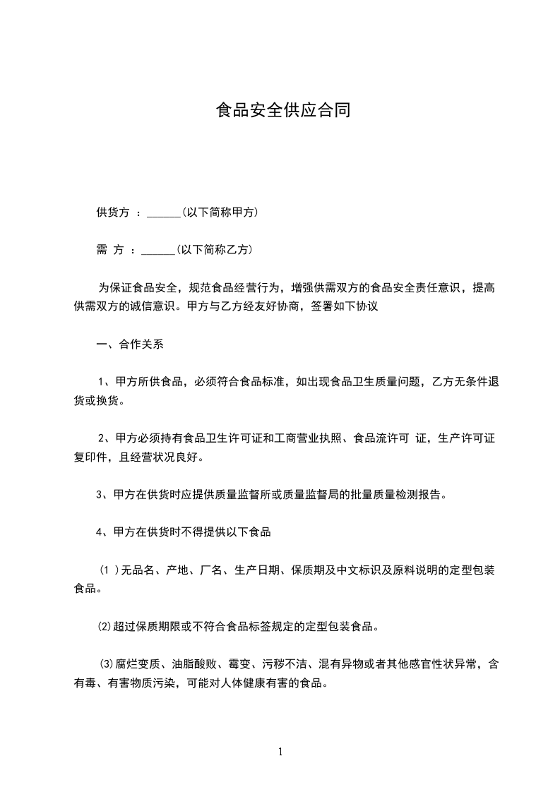 为保证食品安全,规范食品经营行为,增强供需双方的食品安全责任意识,提高供需双方的诚信意识。甲方与乙方经友好协商,签署如下协议