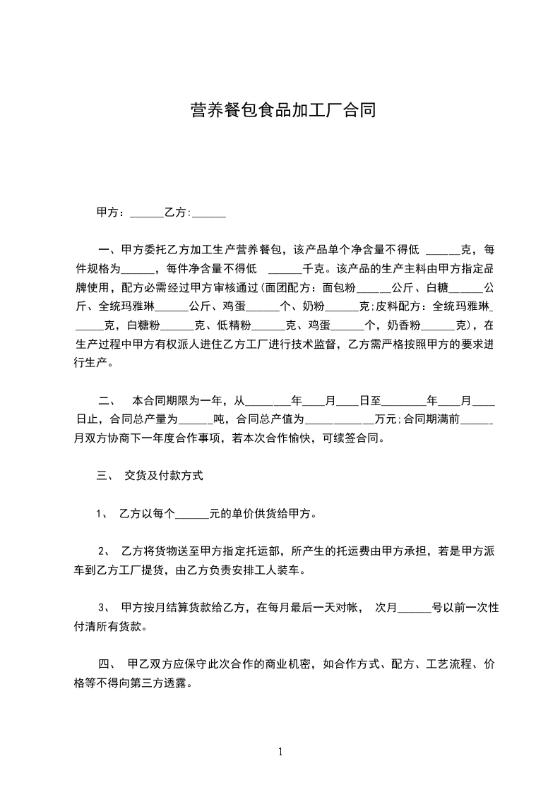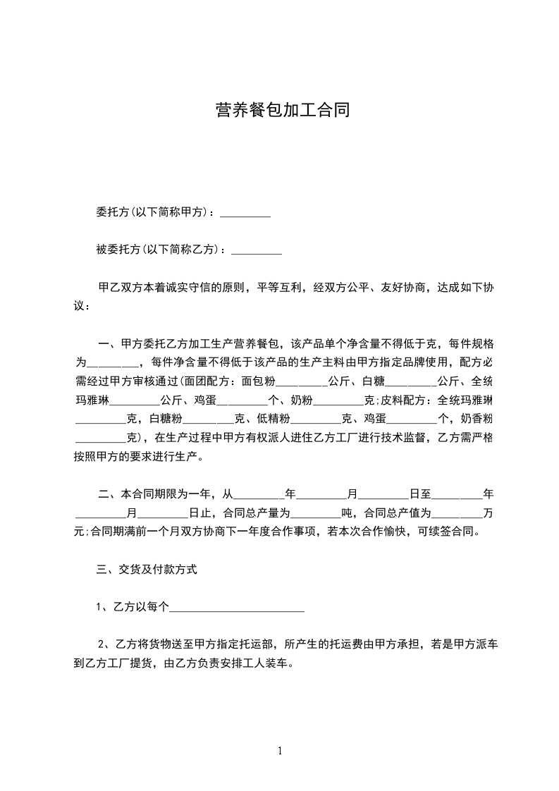 一、甲方委托乙方加工生产营养餐包,该产品单个净含量不得低 ______克,每件规格为______,每件净含量不得低 ______千克。该产品的生产主料由甲方指定品牌使用,配方必需经过甲方审核通过(面团配方:面包粉______公斤、白糖______公斤、全统玛雅琳______公斤、鸡蛋______个、奶粉______克;皮料配方:全统玛雅琳______克,白糖粉______克、低精粉______克、鸡蛋______个,奶香粉______克),在生产过程中甲方有权派人进住乙方工厂进行技术监督,乙方需严格按照甲方的要求进行生产。