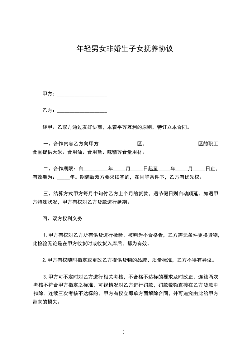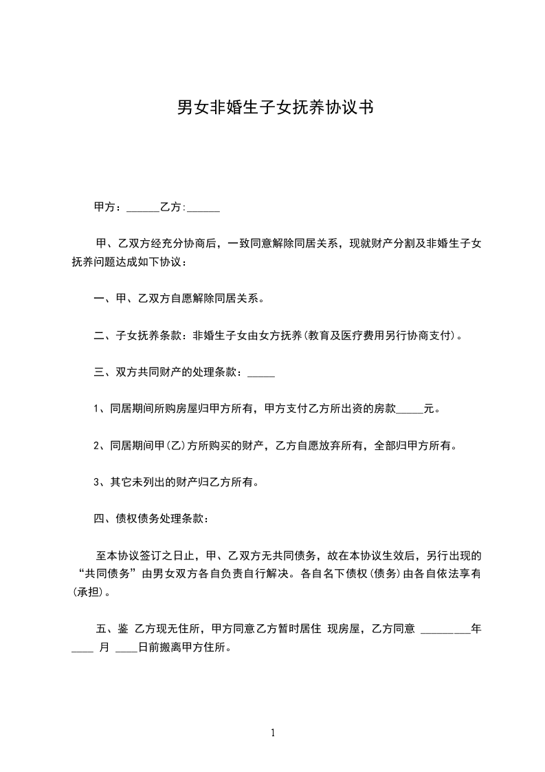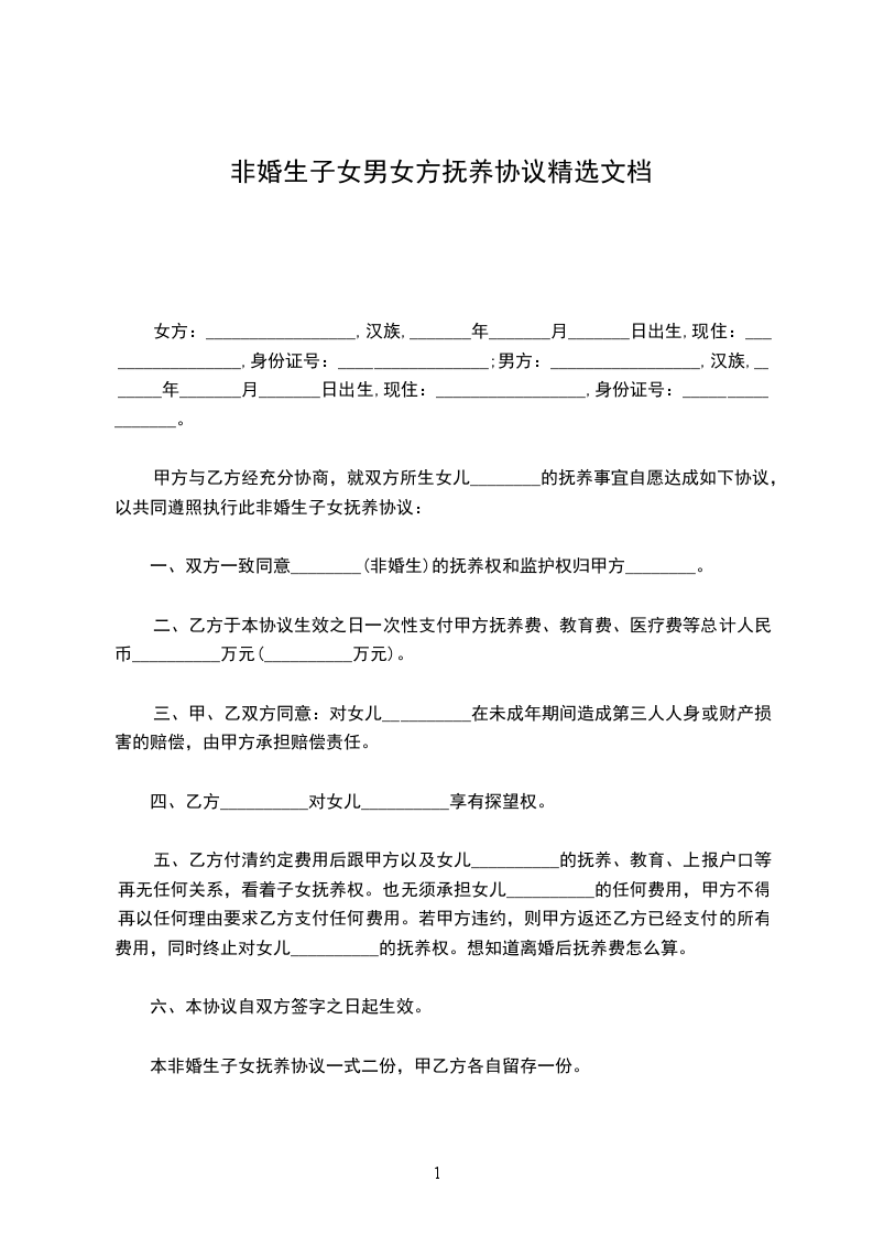 二、子女抚养条款:非婚生子女由女方抚养(教育及医疗费用另行协商支付)。