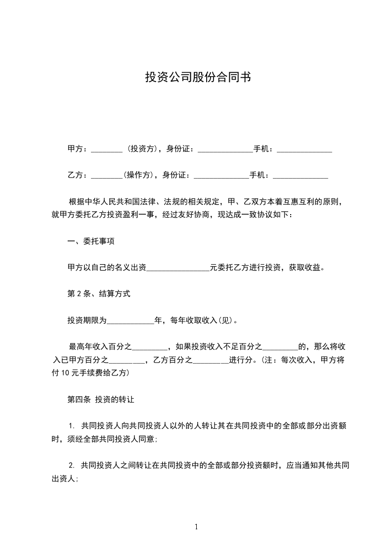 甲方:________ (投资方),身份证:______________手机:______________