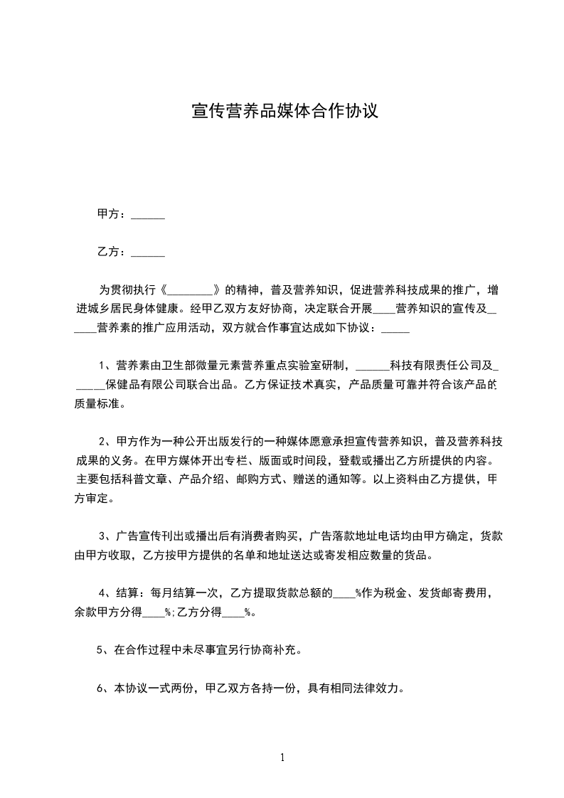 为贯彻执行《________》的精神,普及营养知识,促进营养科技成果的推广,增进城乡居民身体健康。经甲乙双方友好协商,决定联合开展____营养知识的宣传及______营养素的推广应用活动,双方就合作事宜达成如下协议:_____