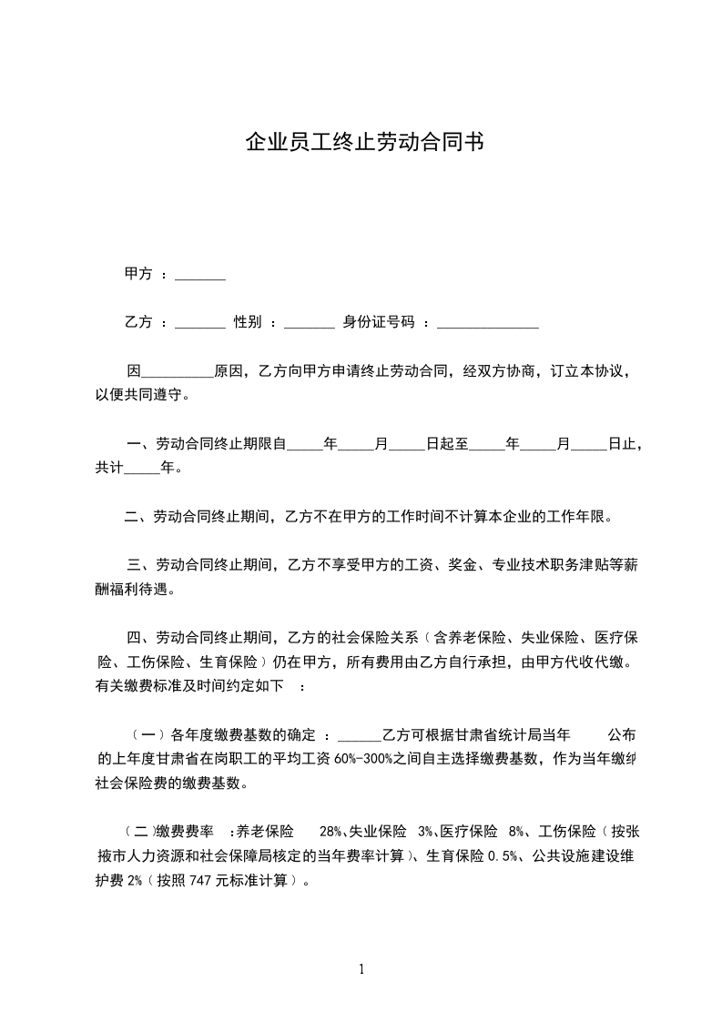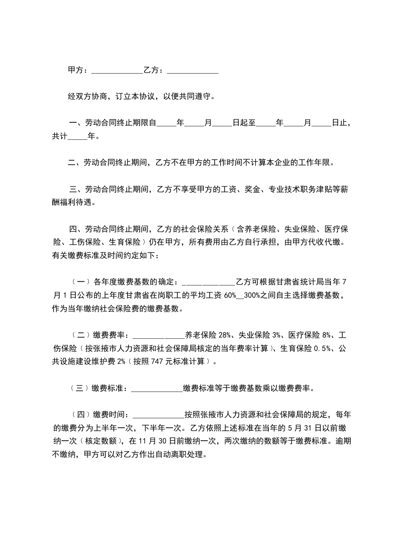 四、劳动合同终止期间,乙方的社会保险关系﹙含养老保险、失业保险、医疗保险、工伤保险、生育保险﹚仍在甲方,所有费用由乙方自行承担,由甲方代收代缴。有关缴费标准及时间约定如下 :