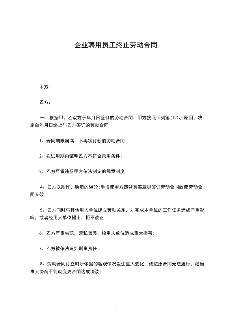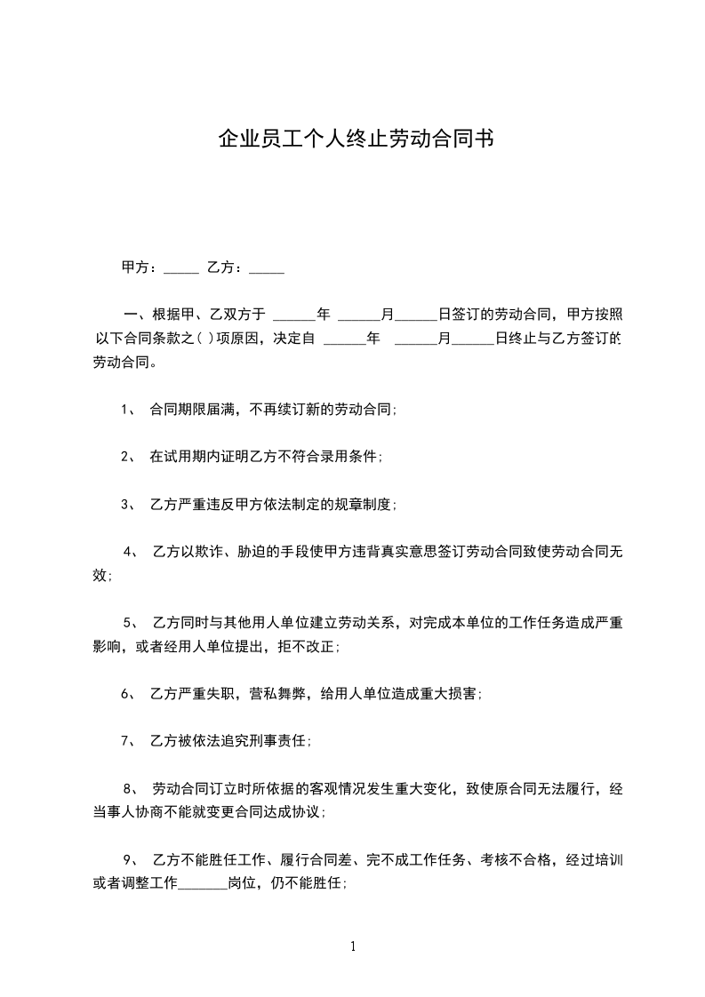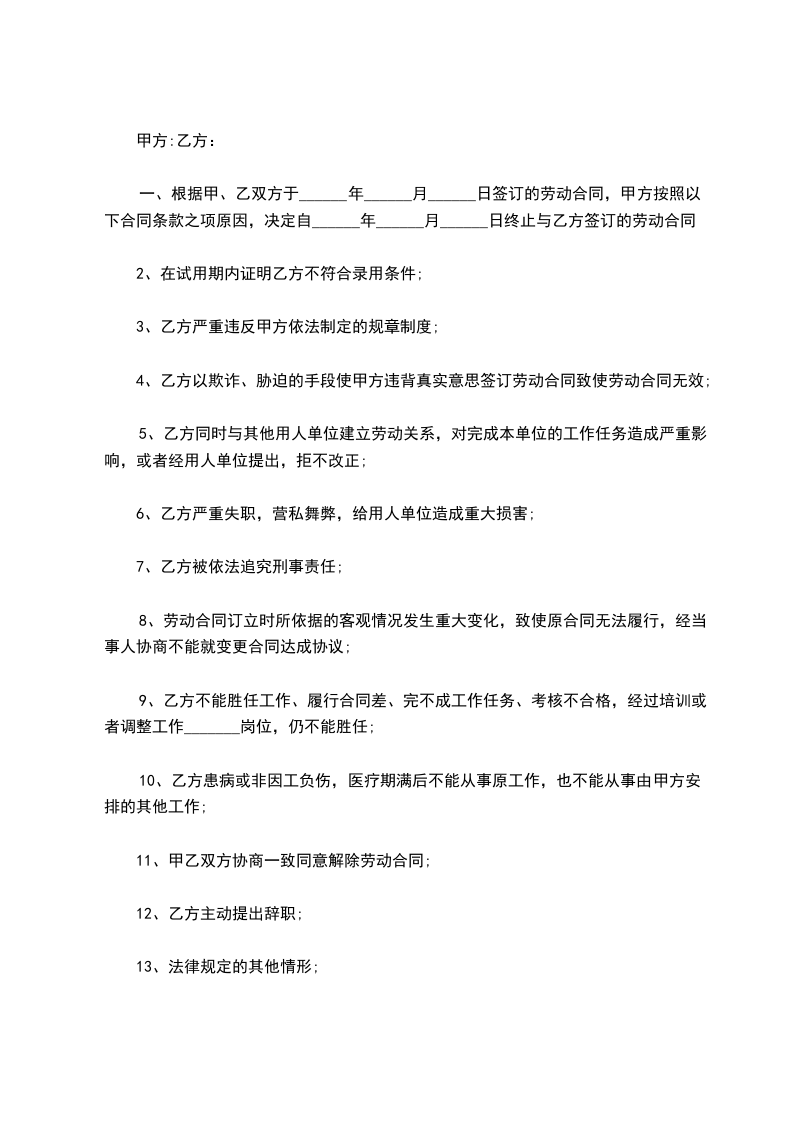 因__________原因,乙方向甲方申请终止劳动合同,经双方协商,订立本协议,以便共同遵守。