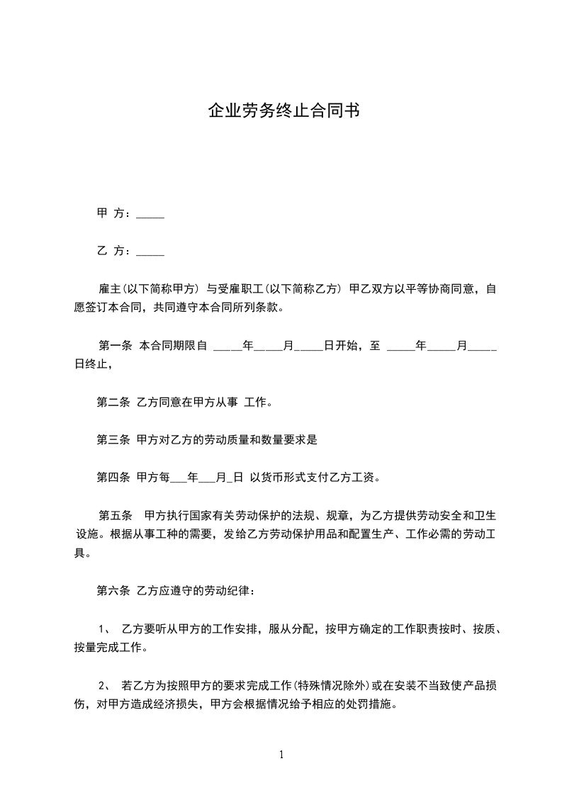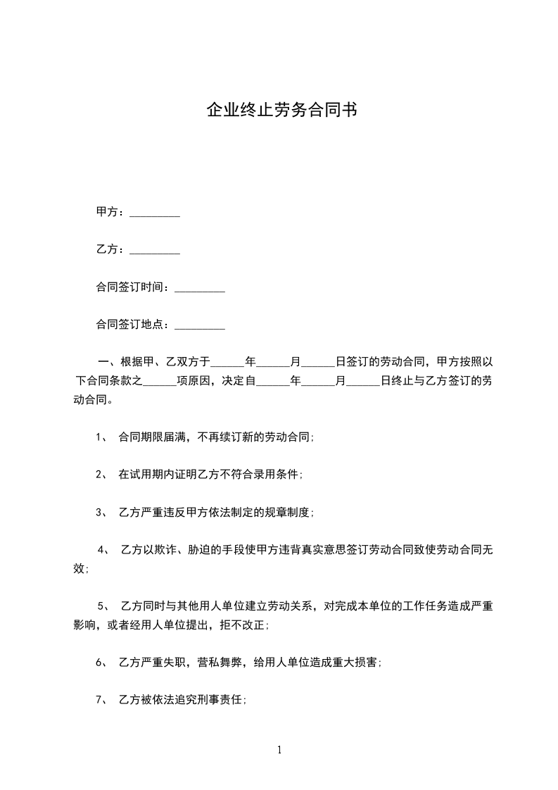 六、劳动合同终止期满,乙方愿意回甲方工作,须在一个月前提出申请,以便甲方及时安排工作。劳动合同终止协议期满后一个月内,乙方未回原单位的,甲方可按自动离职予以处理。
