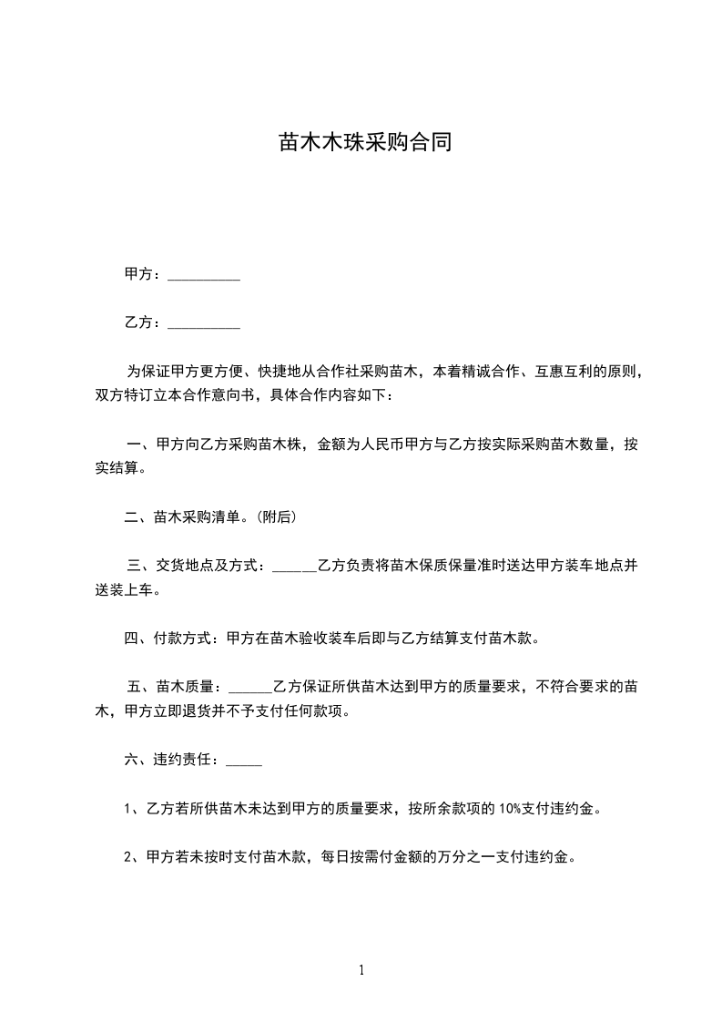 一、甲方向乙方采购苗木株,金额为人民币甲方与乙方按实际采购苗木数量,按实结算。