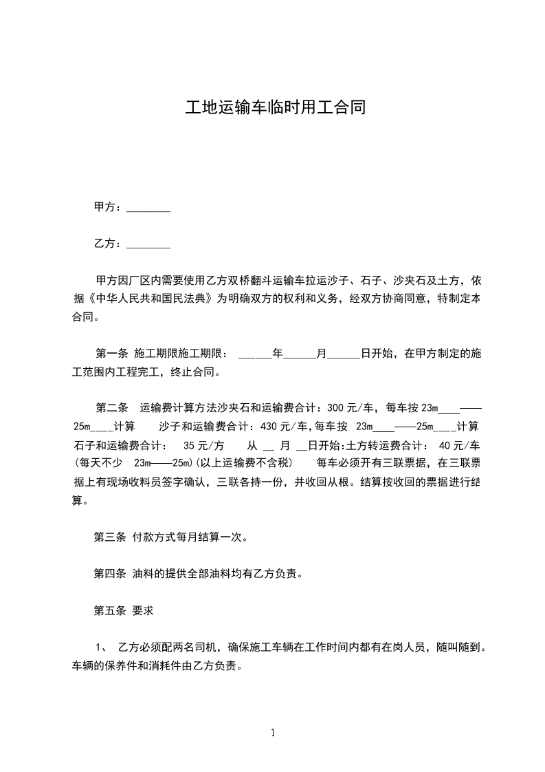 甲方因厂区内需要使用乙方双桥翻斗运输车拉运沙子、石子、沙夹石及土方,依据《中华人民共和国民法典》为明确双方的权利和义务,经双方协商同意,特制定本合同。
