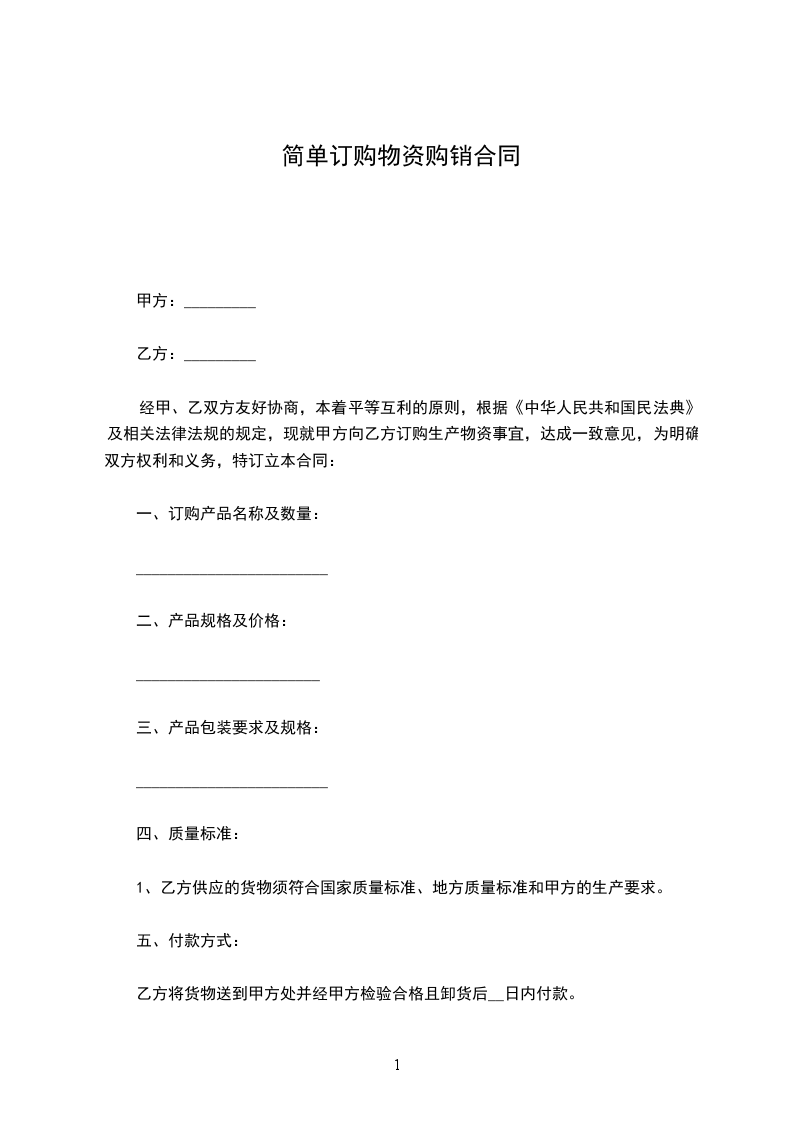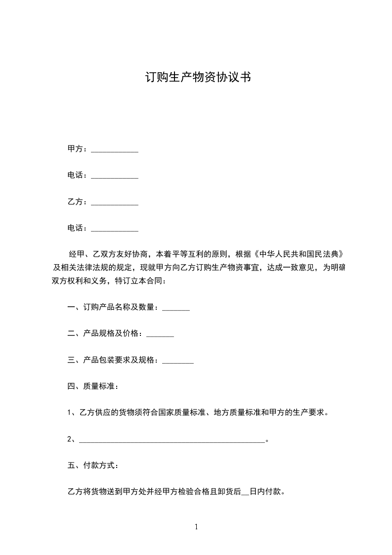 经甲、乙双方友好协商,本着平等互利的原则,根据《中华人民共和国民法典》及相关法律法规的规定,现就甲方向乙方订购生产物资事宜,达成一致意见,为明确双方权利和义务,特订立本合同: