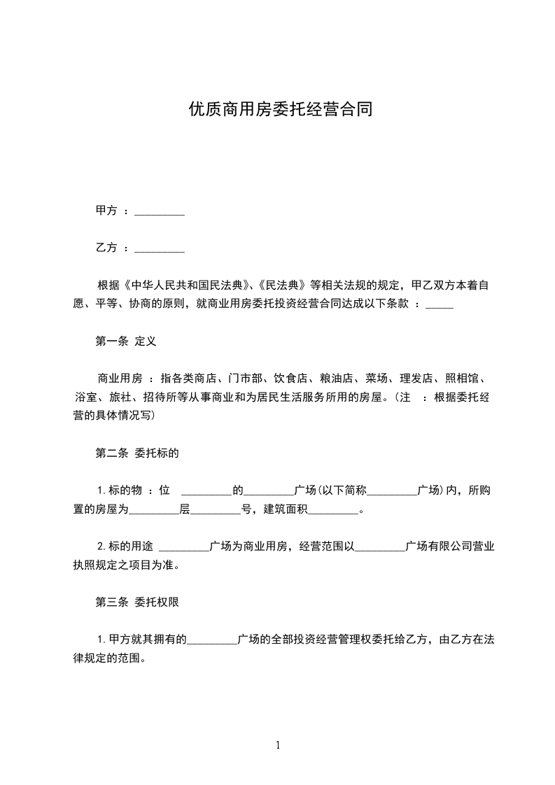 根据《中华人民共和国民法典》、《民法典》等相关法规的规定,甲乙双方本着自愿、平等、协商的原则,就商业用房委托投资经营合同达成以下条款 :_____