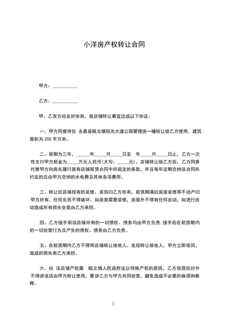 一、甲方同意将位 永嘉县瓯北镇阳光大道公园管理房一幢转让给乙方使用,建筑面积为200平方米。