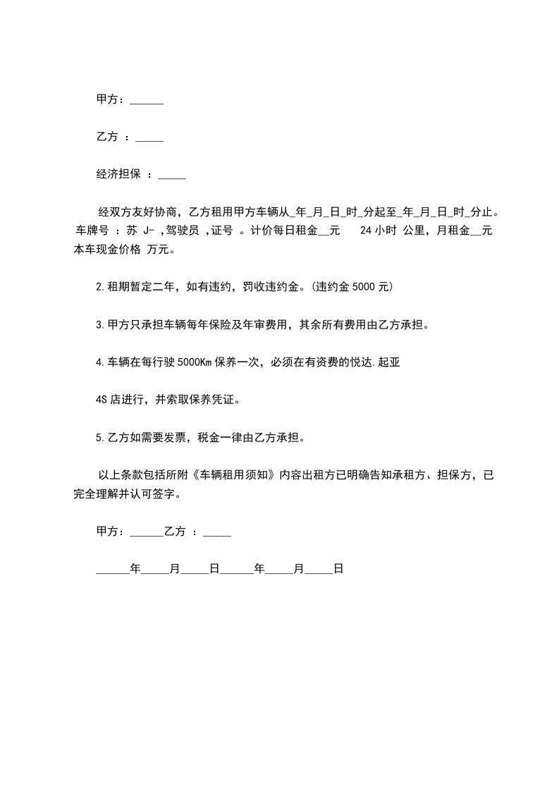 经双方友好协商,乙方租用甲方车辆从_年_月_日_时_分起至_年_月_日_时_分止。车牌号 :苏 J- ,驾驶员 ,证号 。 计价每日租金__元24小时 公里,月租金__元,本车现金价格 万元。