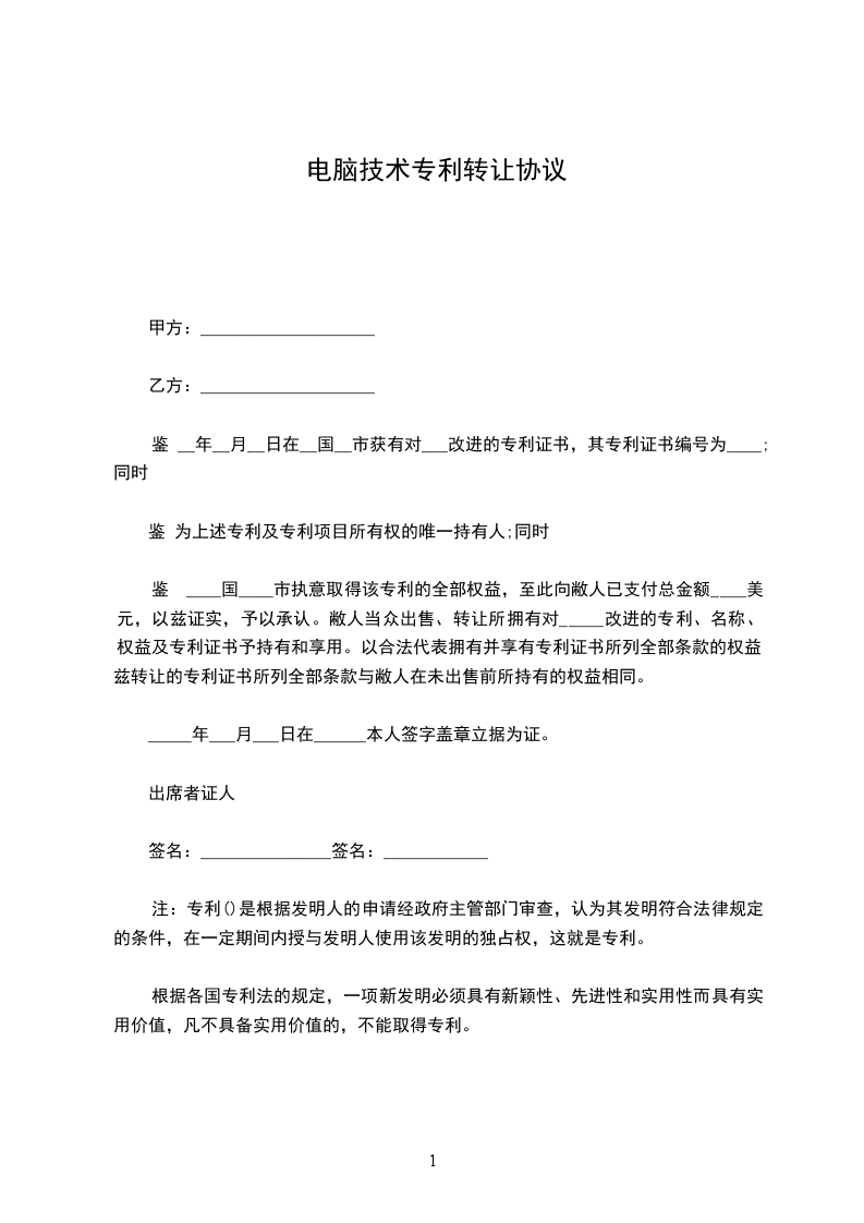 鉴 ____国____市执意取得该专利的全部权益,至此向敝人已支付总金额____美元,以兹证实,予以承认。敝人当众出售、转让所拥有对_____改进的专利、名称、权益及专利证书予持有和享用。以合法代表拥有并享有专利证书所列全部条款的权益。兹转让的专利证书所列全部条款与敝人在未出售前所持有的权益相同。