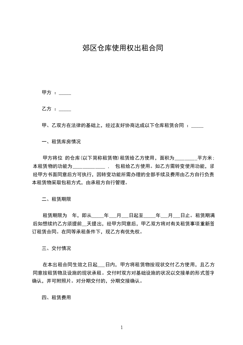 甲、乙双方在法律的基础上,经过友好协商达成以下仓库租赁合同 :_____