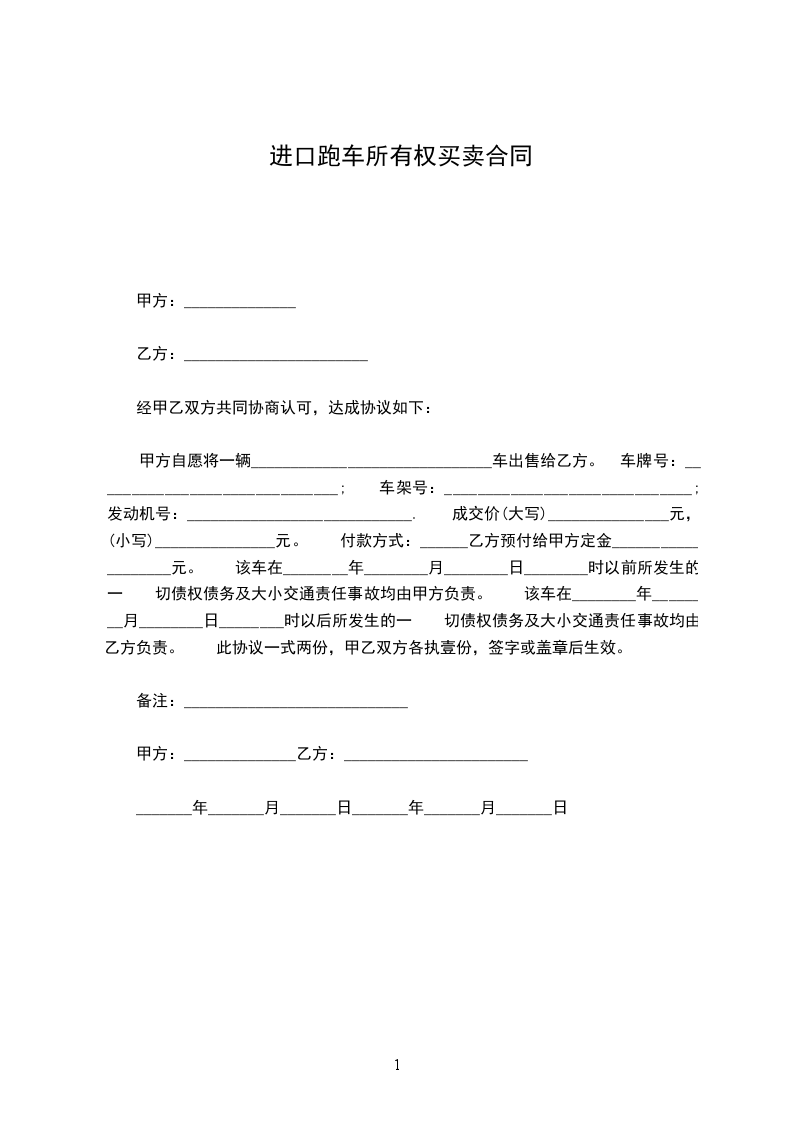 2.甲方须在本协议签订后______天内配合乙方办理车辆过户登记手续,在车辆过户至乙方名下后,乙方一次性现金支付剩余款项;