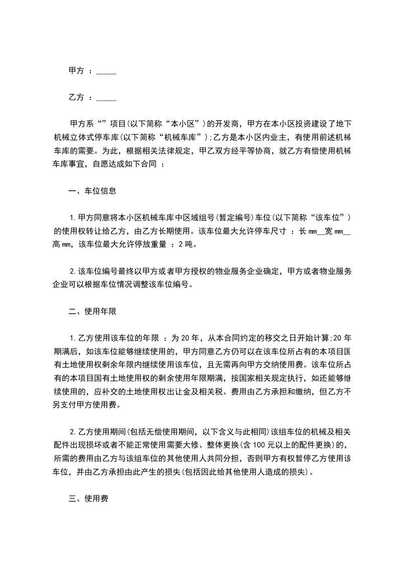 甲方系“”项目(以下简称“本小区”)的开发商,甲方在本小区投资建设了地下机械立体式停车库(以下简称“机械车库”);乙方是本小区内业主,有使用前述机械车库的需要。为此,根据相关法律规定,甲乙双方经平等协商,就乙方有偿使用机械车库事宜,自愿达成如下合同 :