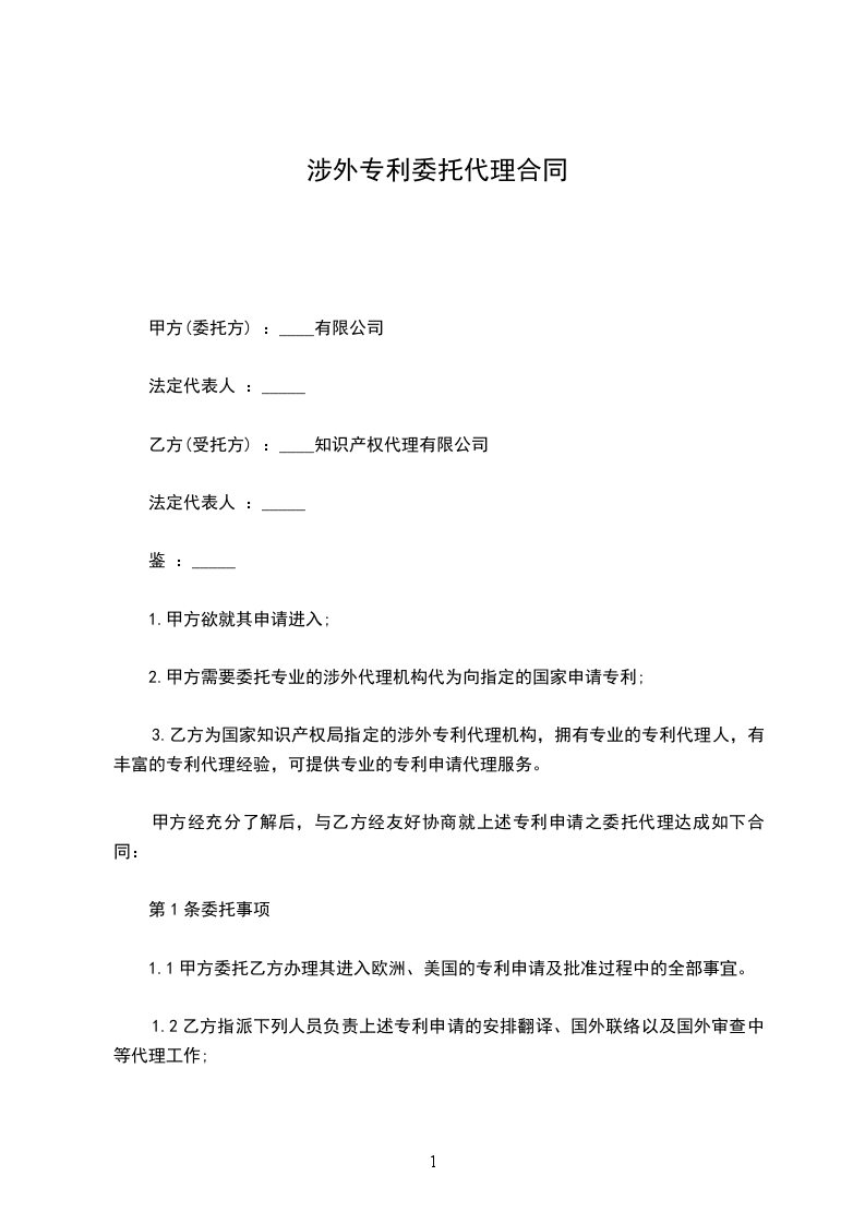 1.1甲方委托乙方办理其进入欧洲、美国的专利申请及批准过程中的全部事宜。