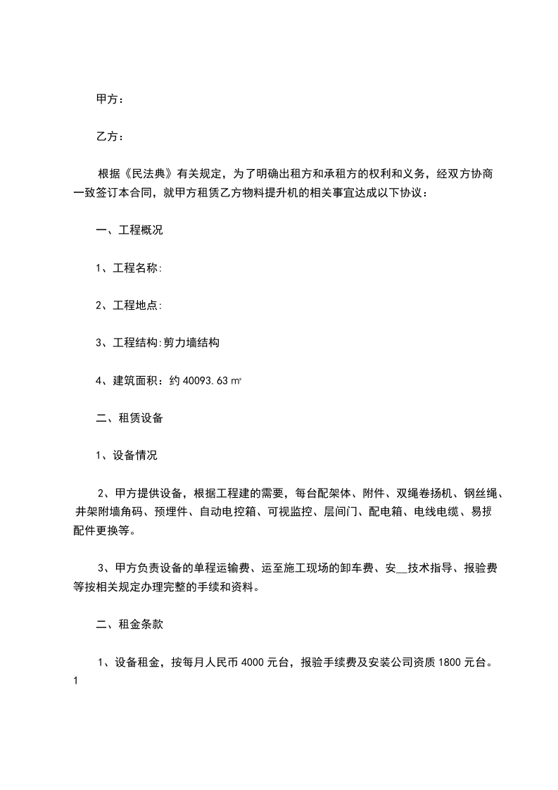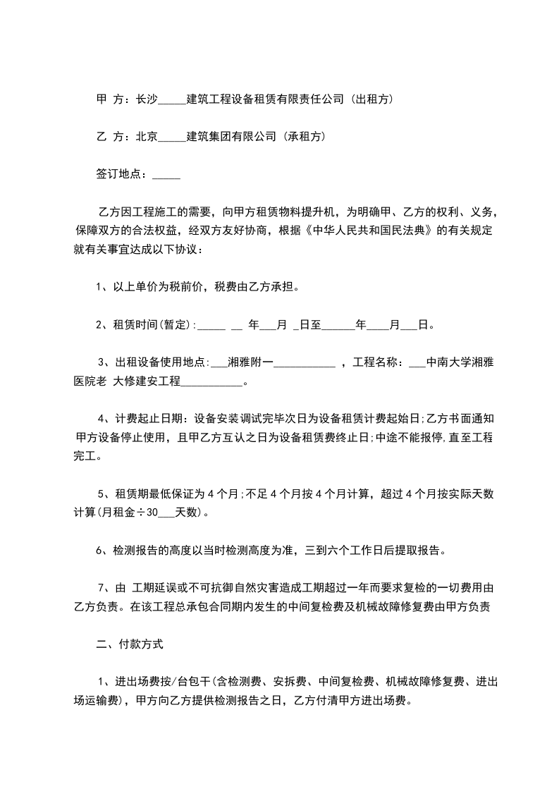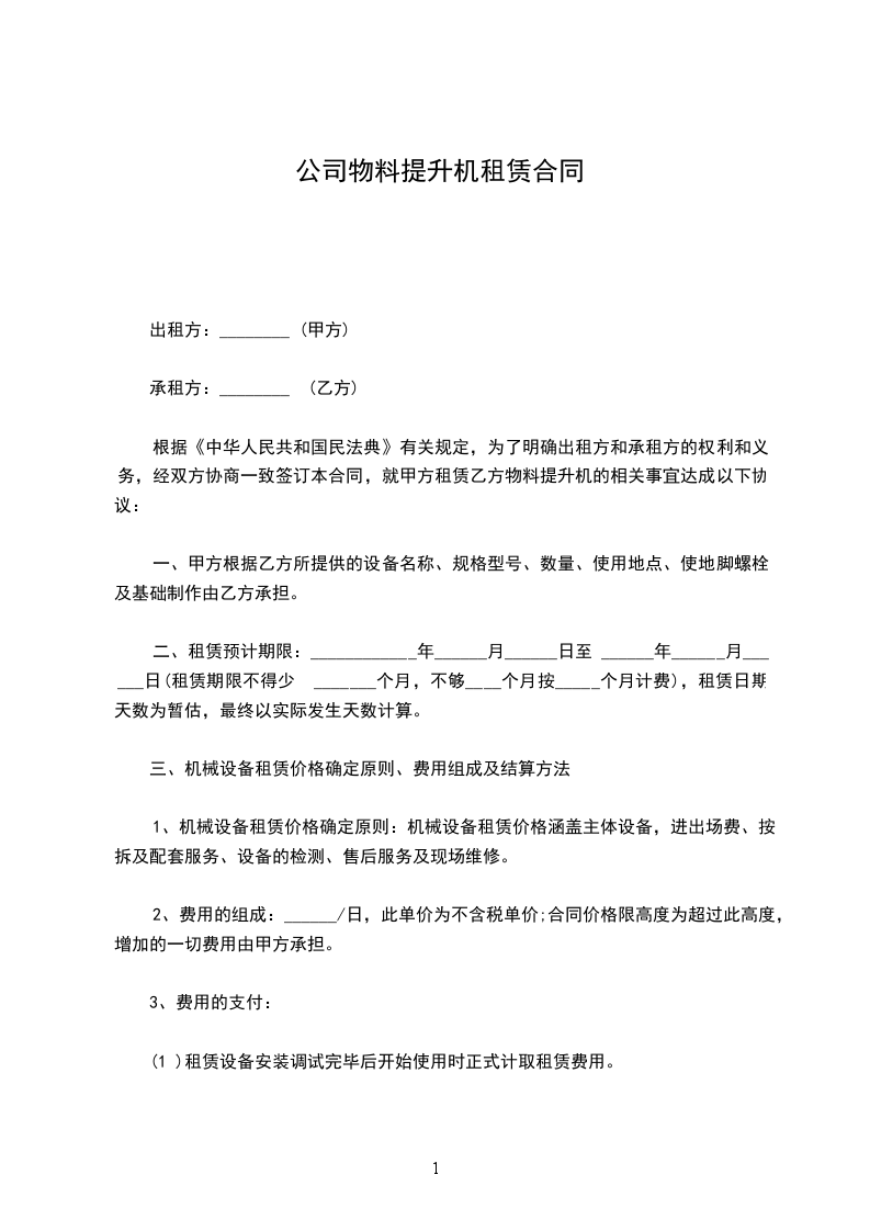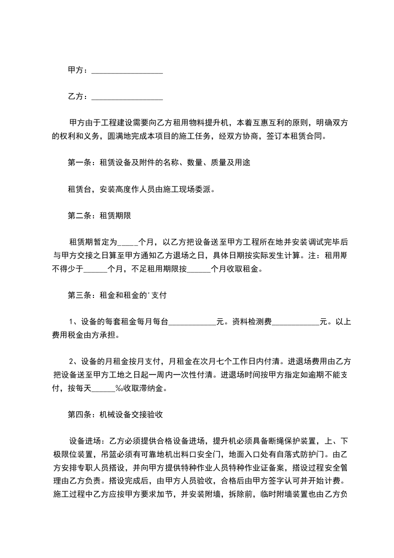 根据《中华人民共和国民法典》有关规定,为了明确出租方和承租方的权利和义务,经双方协商一致签订本合同,就甲方租赁乙方物料提升机的相关事宜达成以下协议: