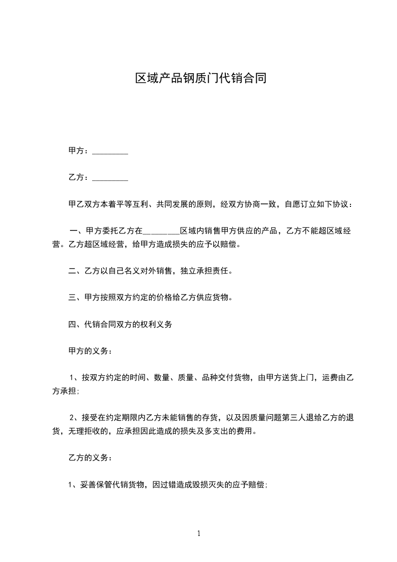 一、甲方委托乙方在_________区域内销售甲方供应的产品,乙方不能超区域经营。乙方超区域经营,给甲方造成损失的应予以赔偿。