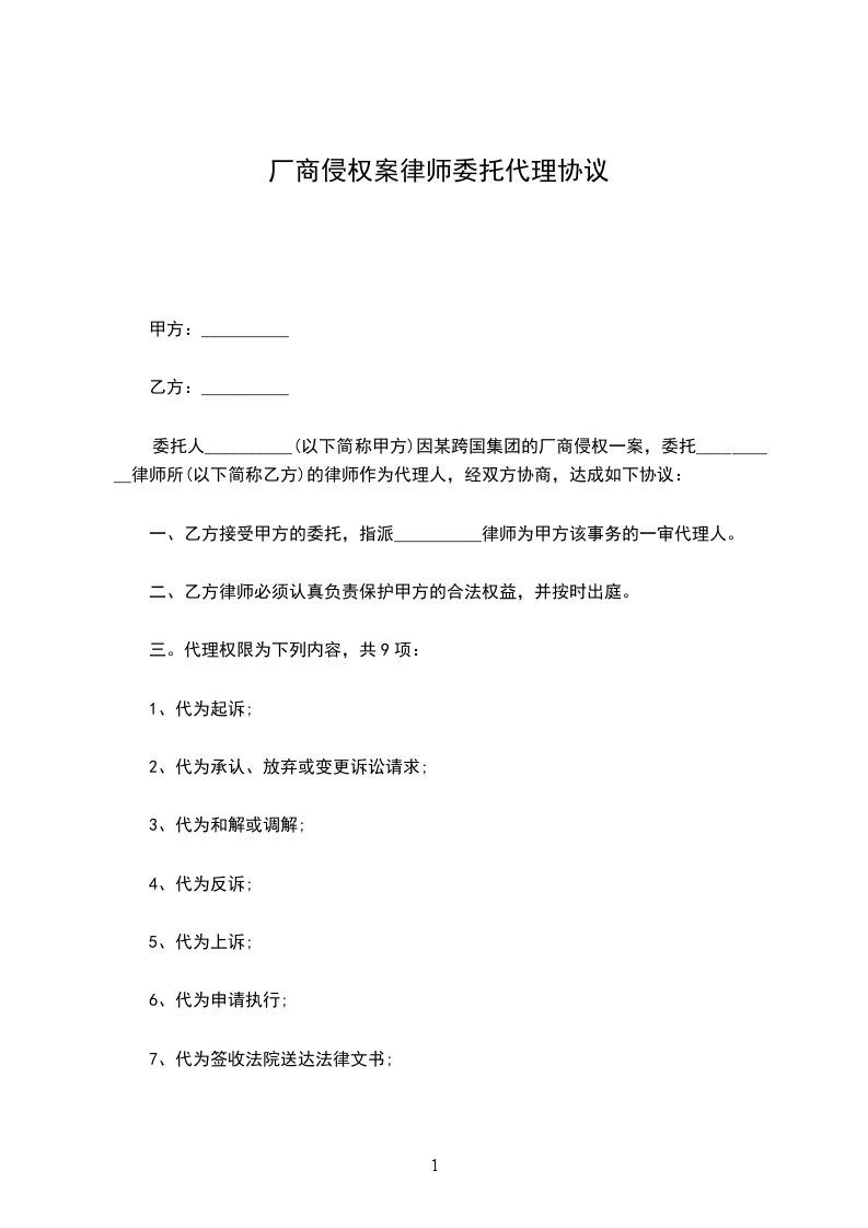 委托人__________(以下简称甲方)因某跨国集团的厂商侵权一案,委托__________律师所(以下简称乙方)的律师作为代理人,经双方协商,达成如下协议: