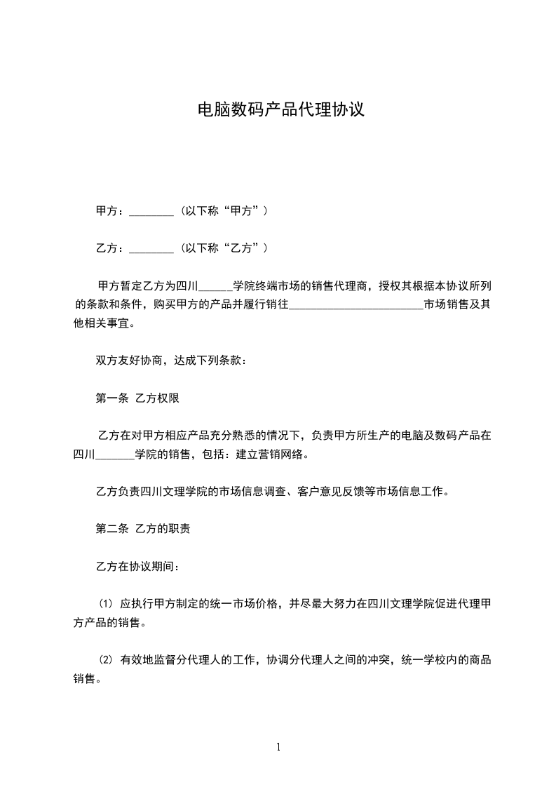 乙方在对甲方相应产品充分熟悉的情况下,负责甲方所生产的电脑及数码产品在四川_______学院的销售,包括:建立营销网络。