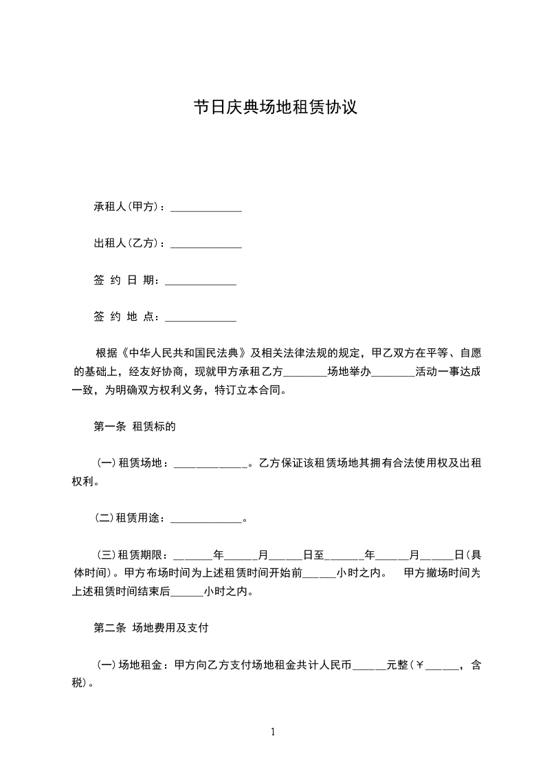 根据《中华人民共和国民法典》及相关法律法规的规定,甲乙双方在平等、自愿的基础上,经友好协商,现就甲方承租乙方________场地举办________活动一事达成一致,为明确双方权利义务,特订立本合同。