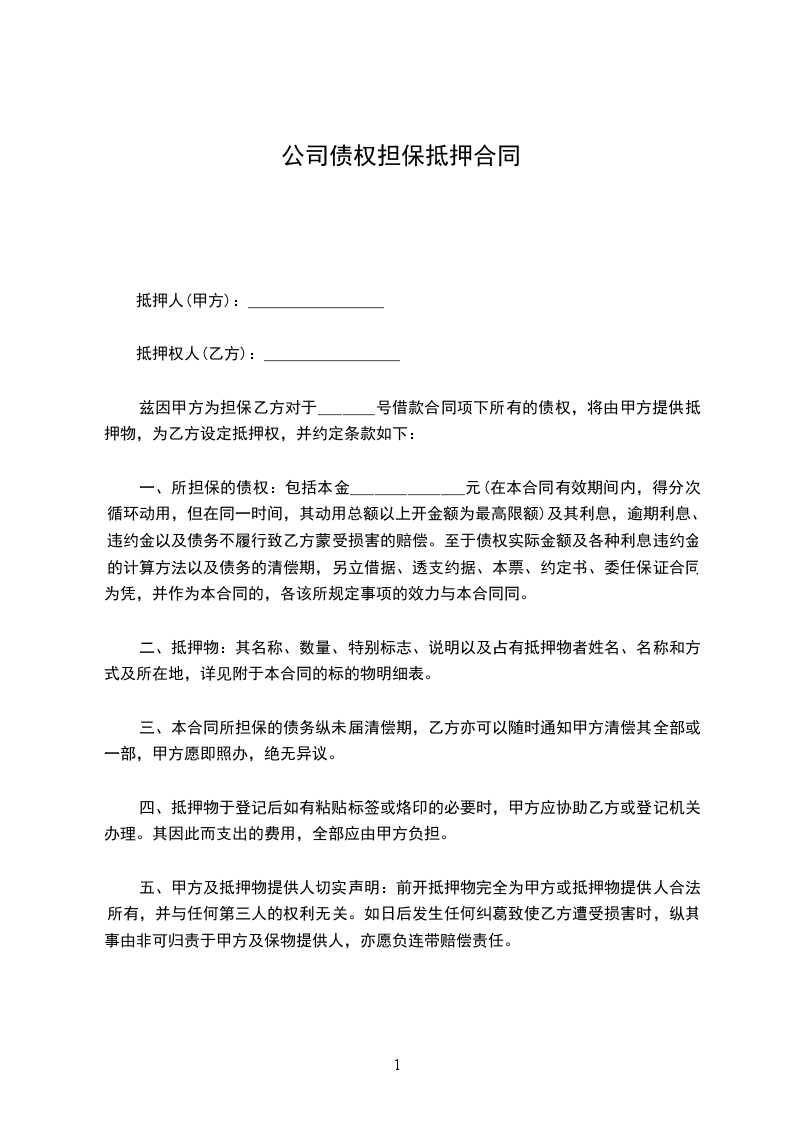 兹因甲方为担保乙方对于_______号借款合同项下所有的债权,将由甲方提供抵押物,为乙方设定抵押权,并约定条款如下: