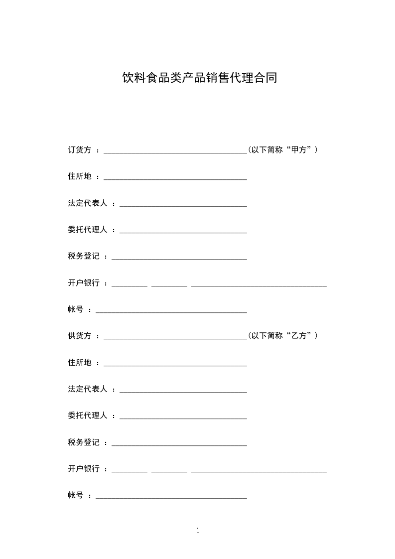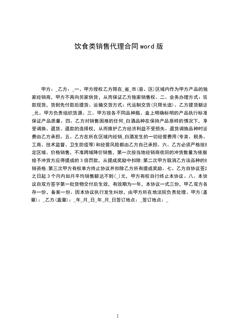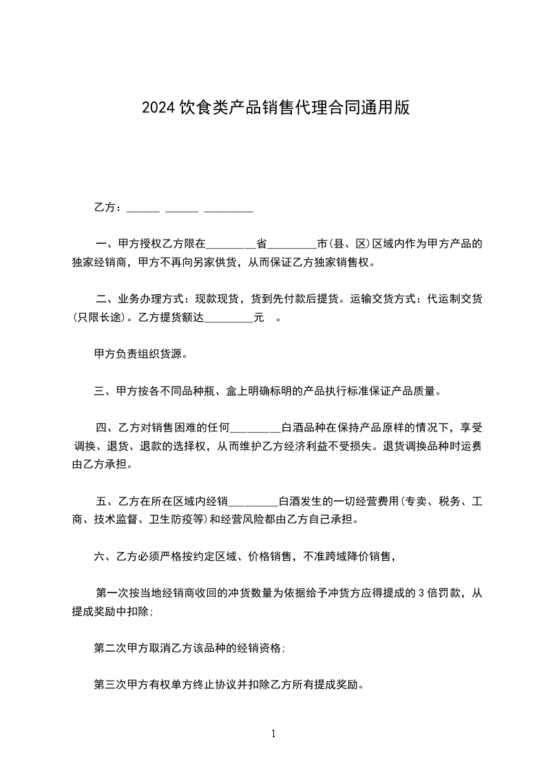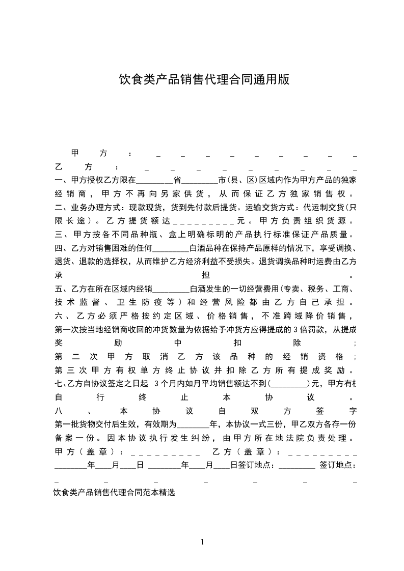 饮食类产品销售代理合同范本精选