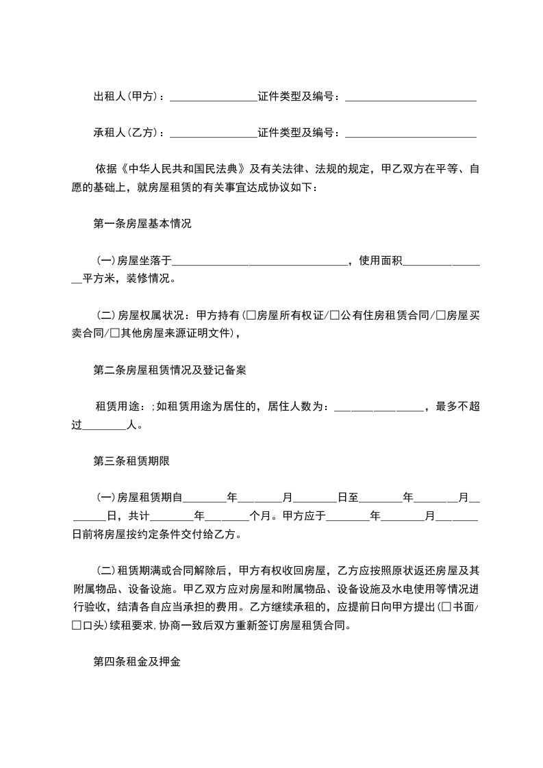 出租方(甲方)____________,男女,________年____月____日出生,身份证号码________________ 承租方(乙方)____________,男女,________年____月____日出生,身份证号码________________ 甲、乙双方就房屋租赁事宜,达成如下协议: