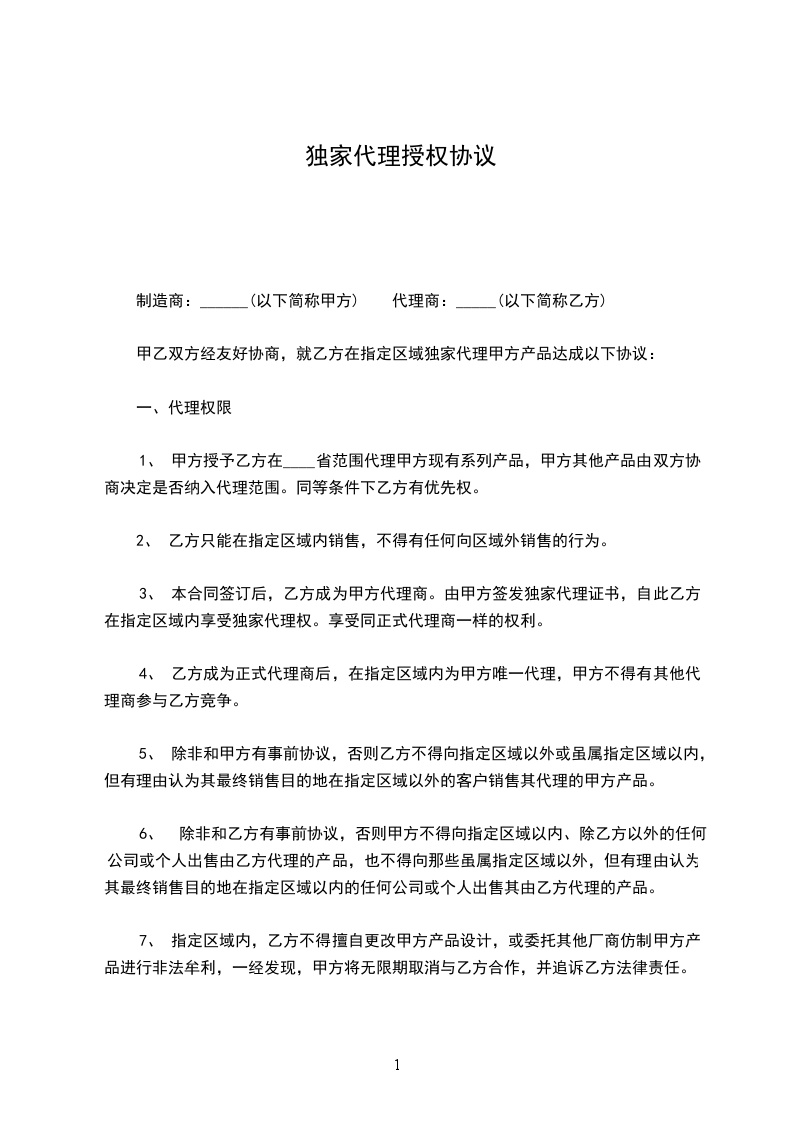 甲乙双方经友好协商,就乙方在指定区域独家代理甲方产品达成以下协议: