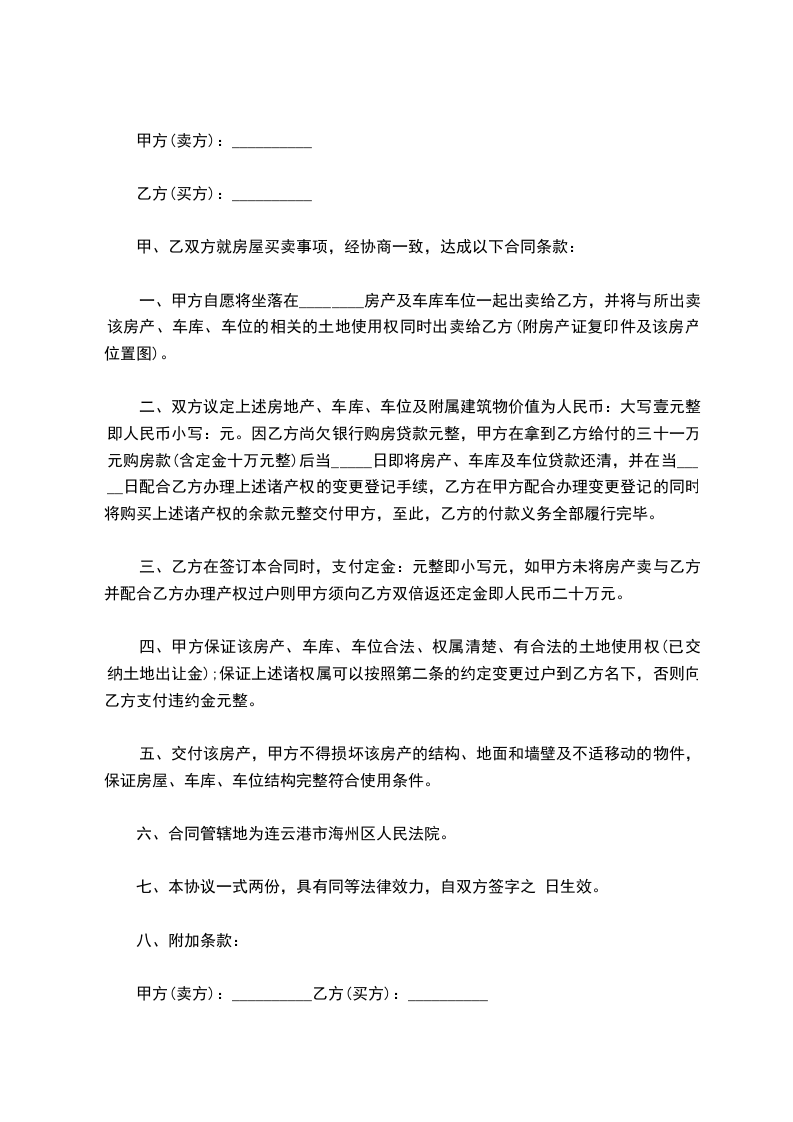 六、 甲乙双方签订该房屋买卖协议后,甲方不得再将该房屋卖给他人,并不得将产权过户给他人或将房屋抵押,否则将承担过错责任。