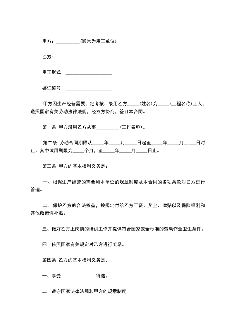 甲方因生产经营需要,经考核,录用乙方_____(姓名)为_____(工程名称)工人,遵照国家有关劳动法律法规,经双方协商,签订本合同。