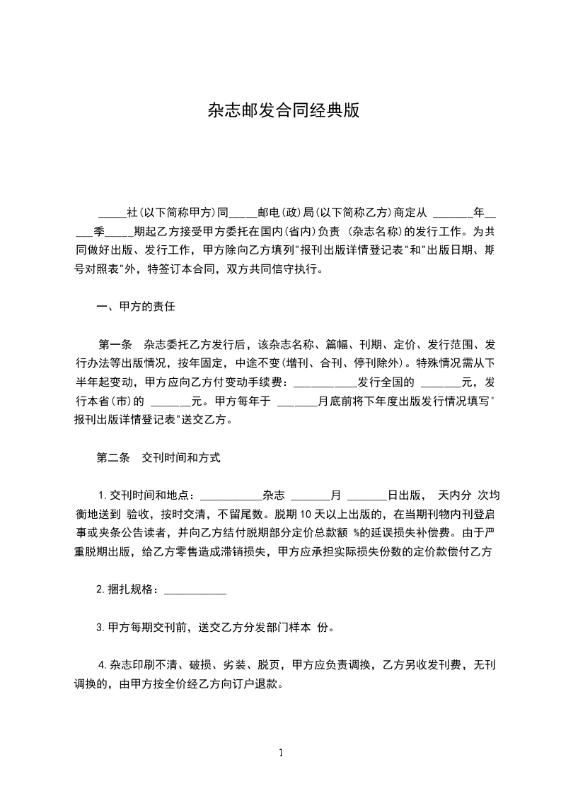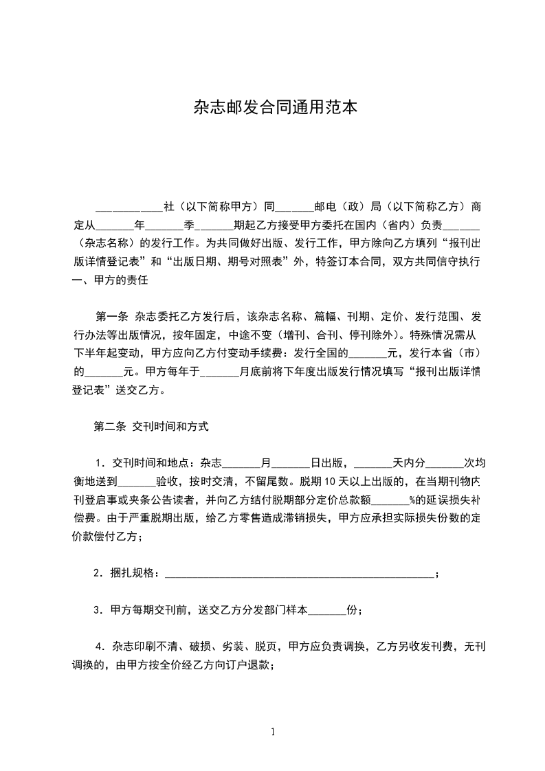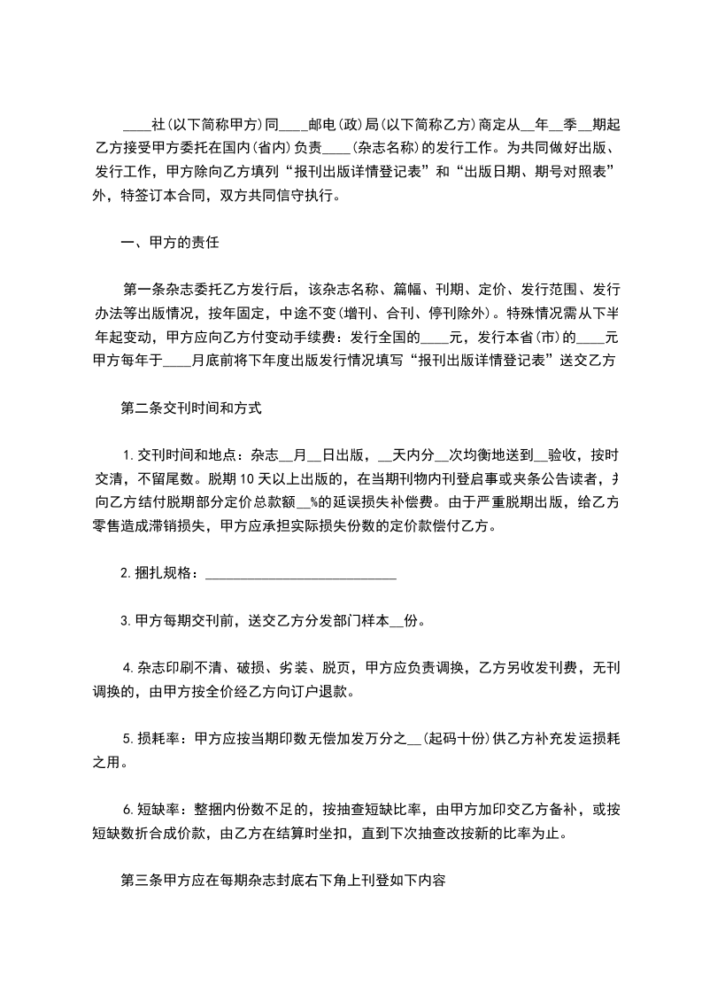 ____社(以下简称甲方)同____邮电(政)局(以下简称乙方)商定从__年__季__期起乙方接受甲方委托在国内(省内)负责____(杂志名称)的发行工作。为共同做好出版、发行工作,甲方除向乙方填列“报刊出版详情登记表”和“出版日期、期号对照表”外,特签订本合同,双方共同信守执行。