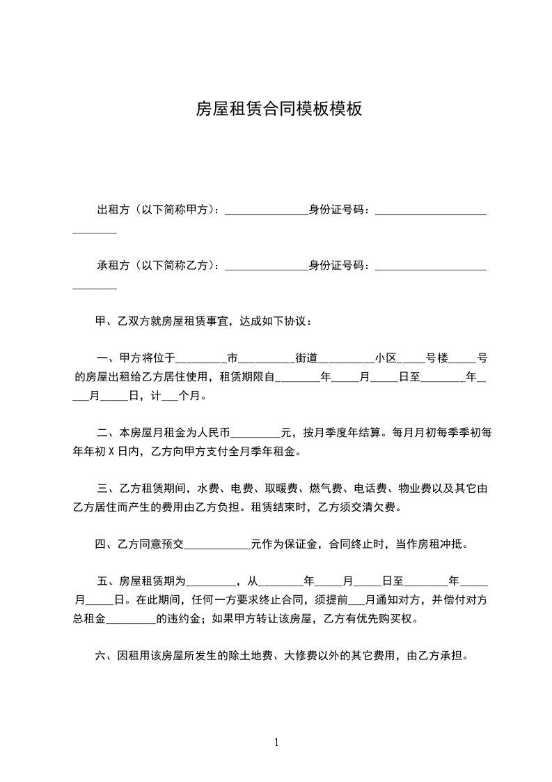 第四条:乙方交纳押金________元,合同未到期,押金不予退还,乙方应保护好屋内设施,如有损坏,照价赔偿;