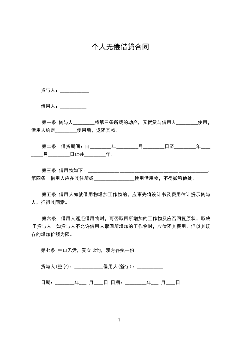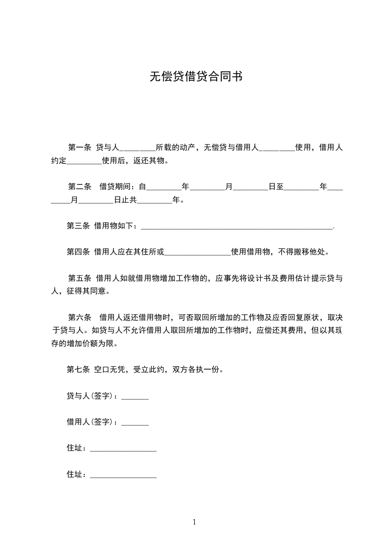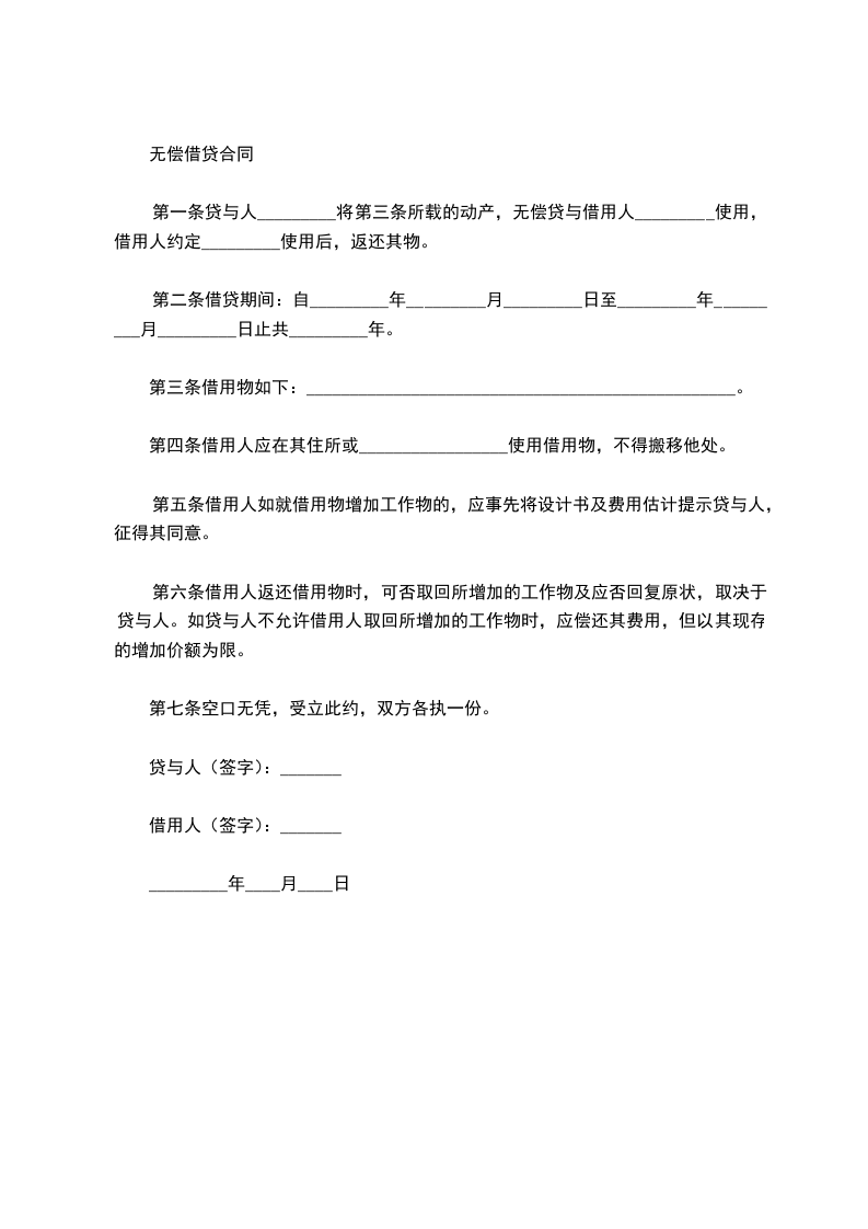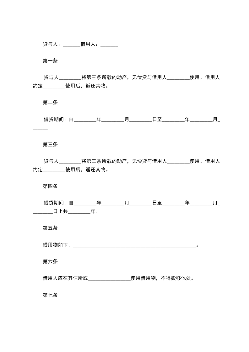 贷与人_________将第三条所载的动产,无偿贷与借用人_________使用,借用人约定_________使用后,返还其物。