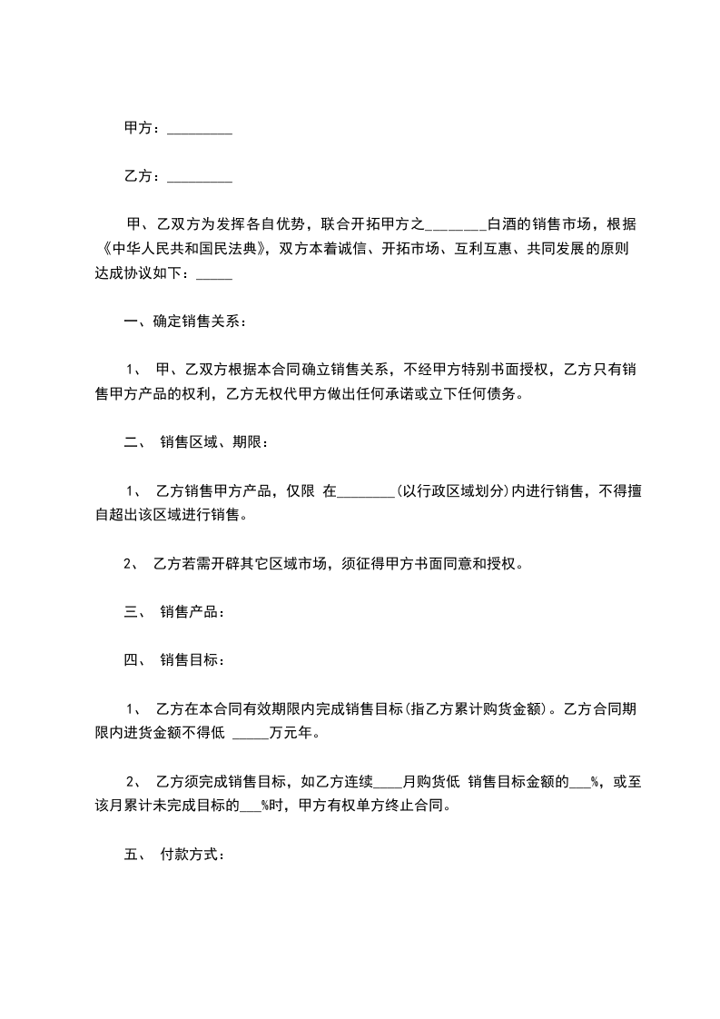 甲、乙双方为发挥各自优势,联合开拓甲方之________白酒的销售市场,根据《中华人民共和国民法典》,双方本着诚信、开拓市场、互利互惠、共同发展的原则达成协议如下:_____