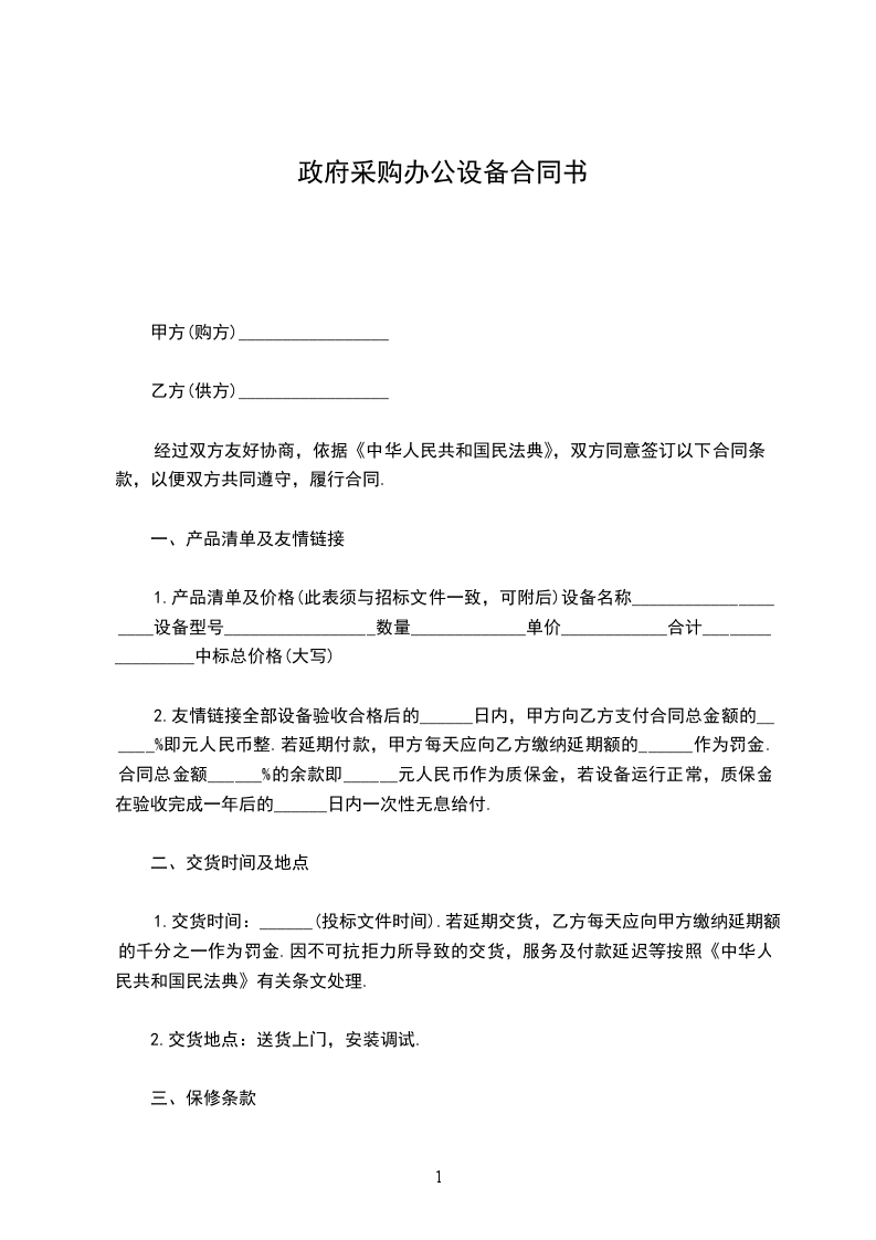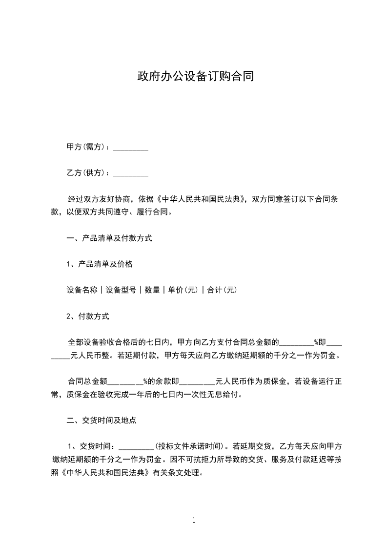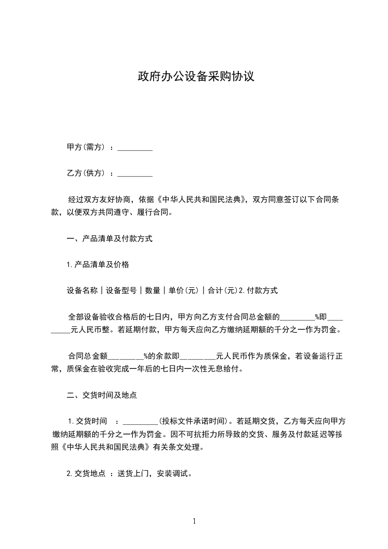 1.交货时间 :_________(投标文件承诺时间)。若延期交货,乙方每天应向甲方缴纳延期额的千分之一作为罚金。因不可抗拒力所导致的交货、服务及付款延迟等按照《中华人民共和国民法典》有关条文处理。