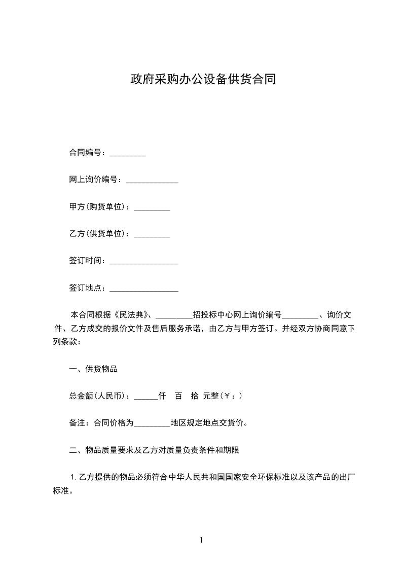 1.甲方收到乙方设备后,乙方应在_________政府采购管理办公室、_________监察审计部门、_________政府采购中心的共同监督下及时验收,验收时可对不符合合同要求及评标样本的设备或产品拒绝接收;
