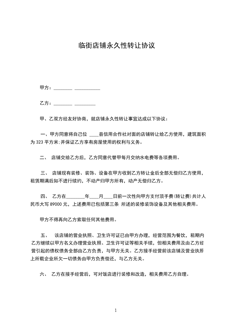 甲、乙双方经友好协商,就店铺永久性转让事宜达成以下协议: