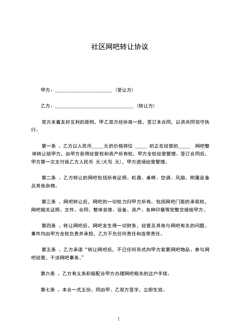 第一条 、乙方以人民币_____元的价格将位 _____ 的正在经营的_____ 网吧整体转让给甲方,由甲方获得经营权和资产所有权,甲方全权经营管理。签订合同后,甲方第一次支付给乙方人民币 元(大写 元),甲方进场经营管理。
