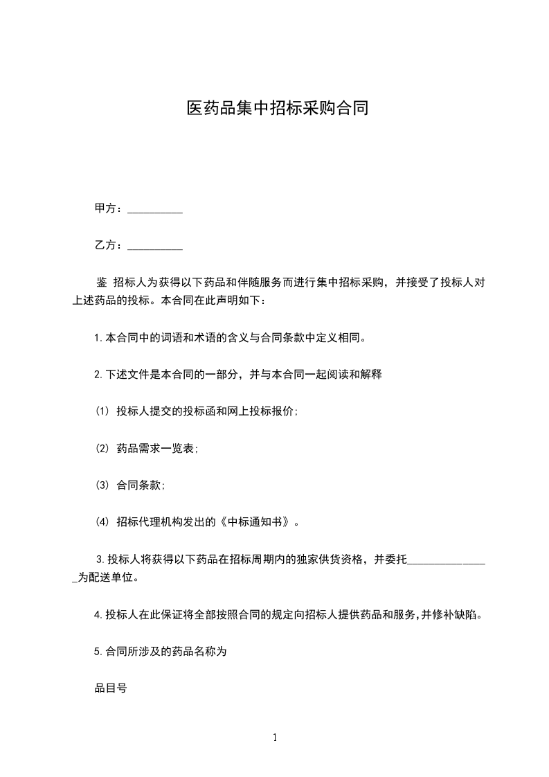 鉴 招标人为获得以下药品和伴随服务而进行集中招标采购,并接受了投标人对上述药品的投标。本合同在此声明如下: