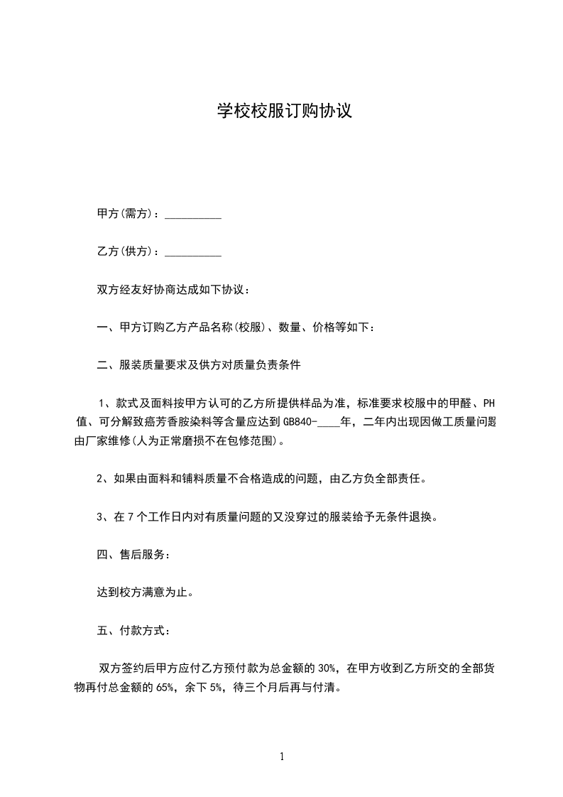 1、款式及面料按甲方认可的乙方所提供样品为准,标准要求校服中的甲醛、PH值、可分解致癌芳香胺染料等含量应达到GB840-____年,二年内出现因做工质量问题由厂家维修(人为正常磨损不在包修范围)。