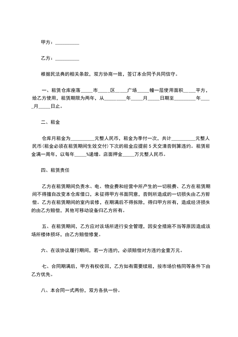 一、租赁仓库座落_____市_____区_____广场_____幢一层使用面积_____平方,给乙方使用,租赁期限为两年,从_________年_____月_____日期至_________年_____月_____日止。